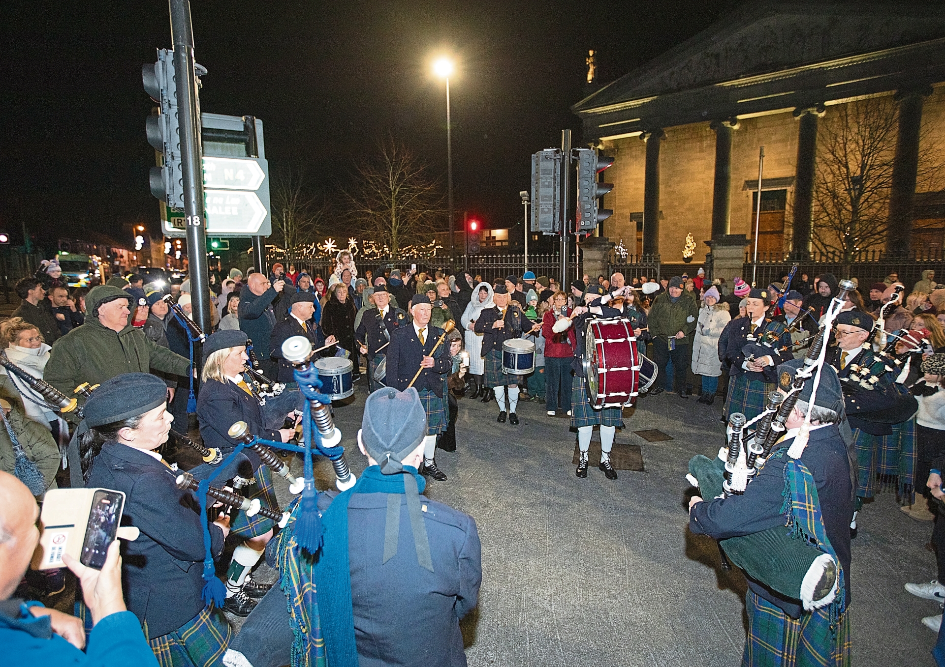 Caption: Longford Pipe Band playing 'Auld Lang Syne' outside St Mel's Cathedral on New Year's Eve