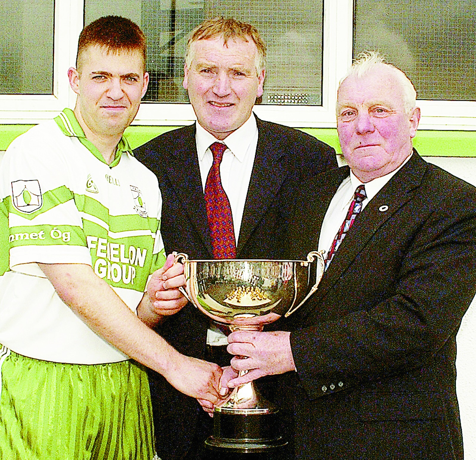 Caption: Peter Maguire, captain of the Killoe team, receives the Michael Kiernan Memorial Cup from Victor Kiernan (father of the late Michael) with Emmet Og Chairman Frank Kiernan also pictured in the presentation of the trophy. Killoe beat Sean Connolly's in the annual tournament game between the clubs on the May Bank Holiday weekend. Picture: Joe McDonagh