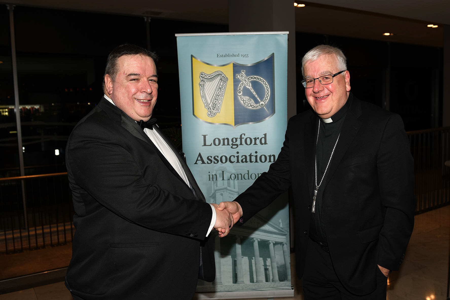 Caption: Longford Association in London President Aiden Ganly (Lanesboro) is pictured welcoming the Bishop of Ardagh and Clonmacnois Bishop Paul Connell to the 68th annual Longford Association London dinner and dance in the Clayton Hotel Chiswick in West London on Saturday, February 3 Picture: Malcom McNally Photography
