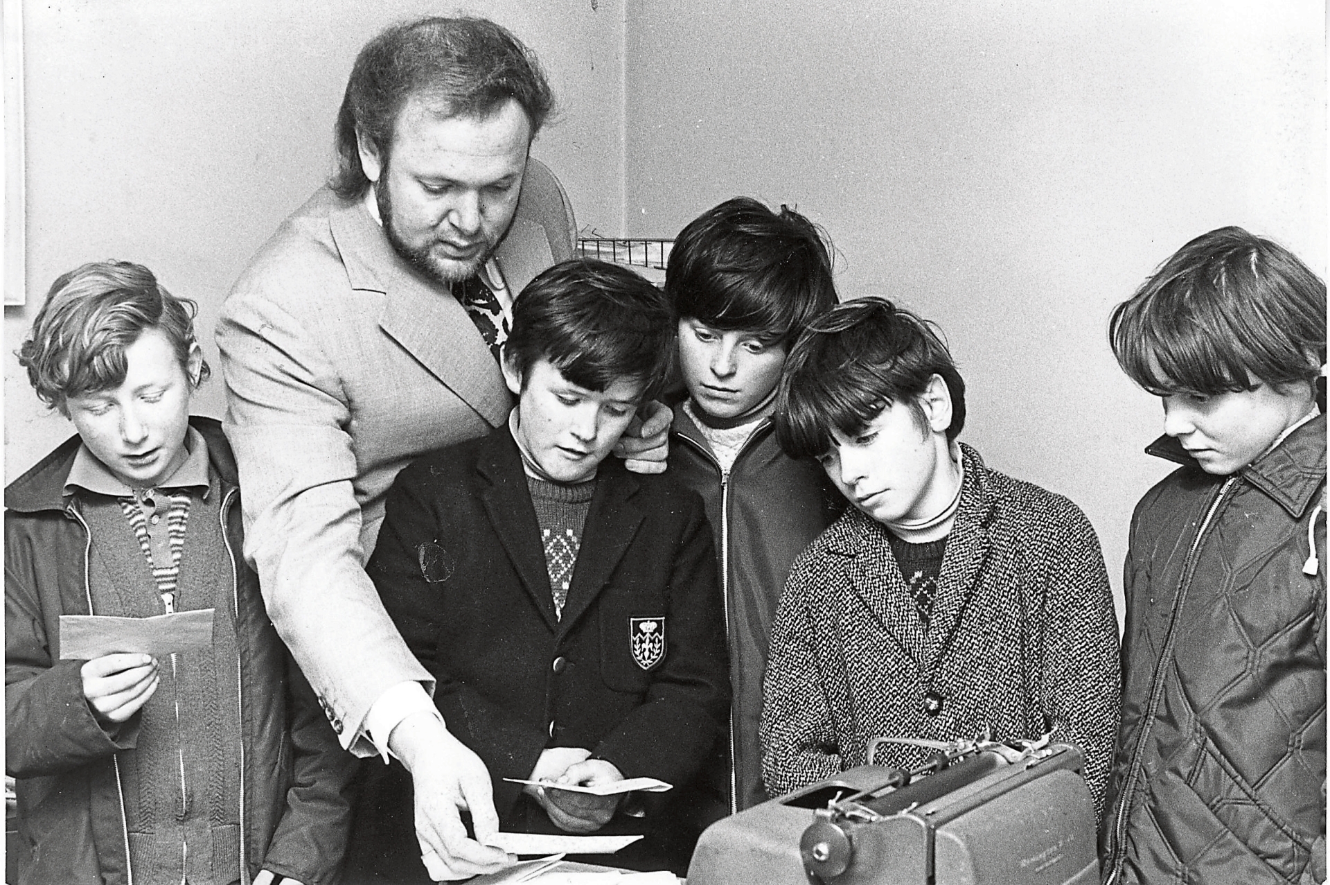 Caption: Uncle Larry, (aka Derek Cobbe) of The Longford Leader, sifting through the mail from Uncle Larry's page in the Leader office on the Market Square. Photo includes left to right: Peter McKenna, Derek Cobbe, Padraic O'Brien, Michael Shanley, Tom O'Brien and Farrell Harrison