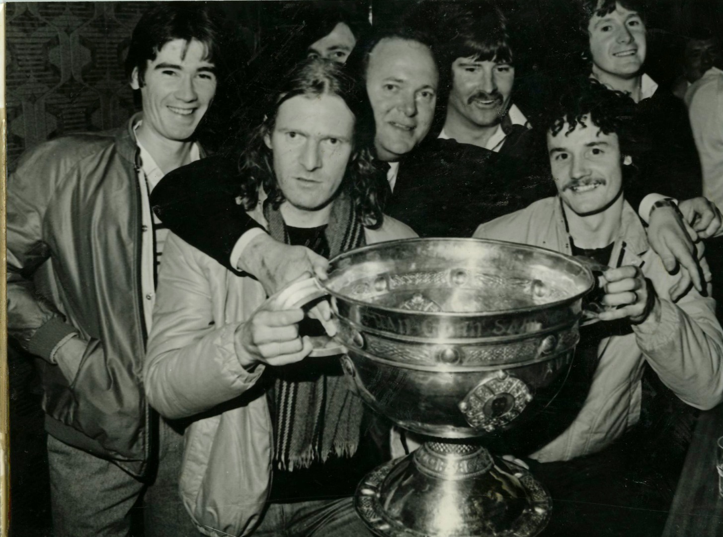 Caption: John Duignan, Jimmy Brady, Zac Hackett; Longford News Editor Derek Cobbe, and in the background, Milo Reilly and Liam Connerton, pictured with the Sam Maguire Cup in Clarke’s in 1982