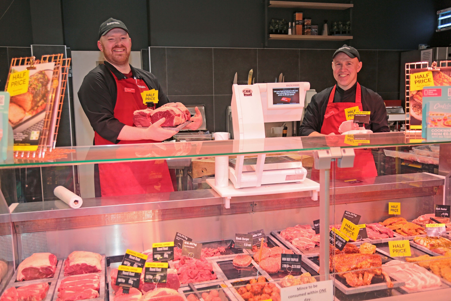 Caption: Francis J Burke and Trevor Donlon at the butcher counter in Keane's SuperValu Lanesboro Picture: Shelley Corcoran