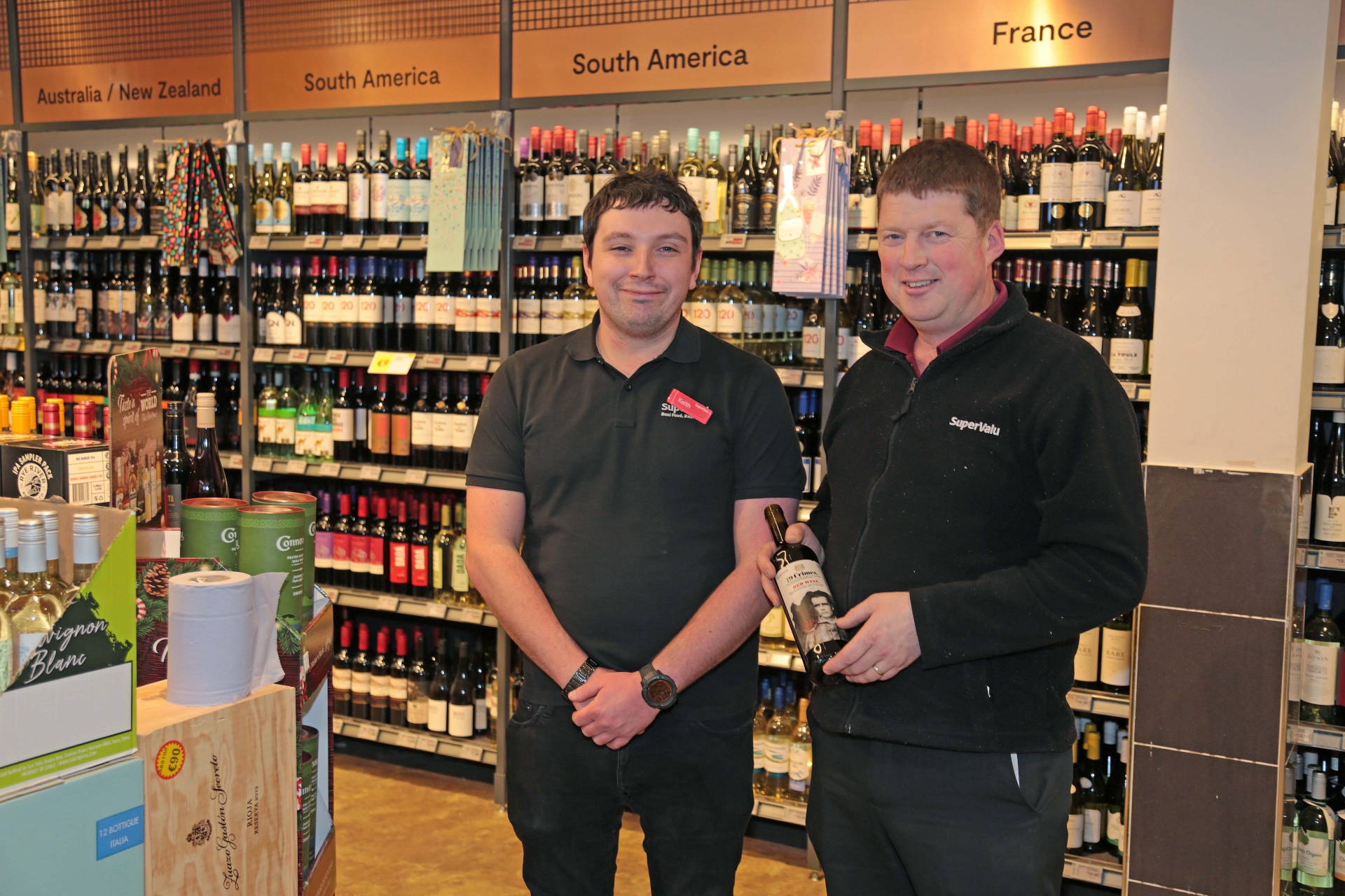 Caption: Keith McCaffrey and Alan Horohoe at the extensive selection of wines at Keane's SuperValu, Lanesboro