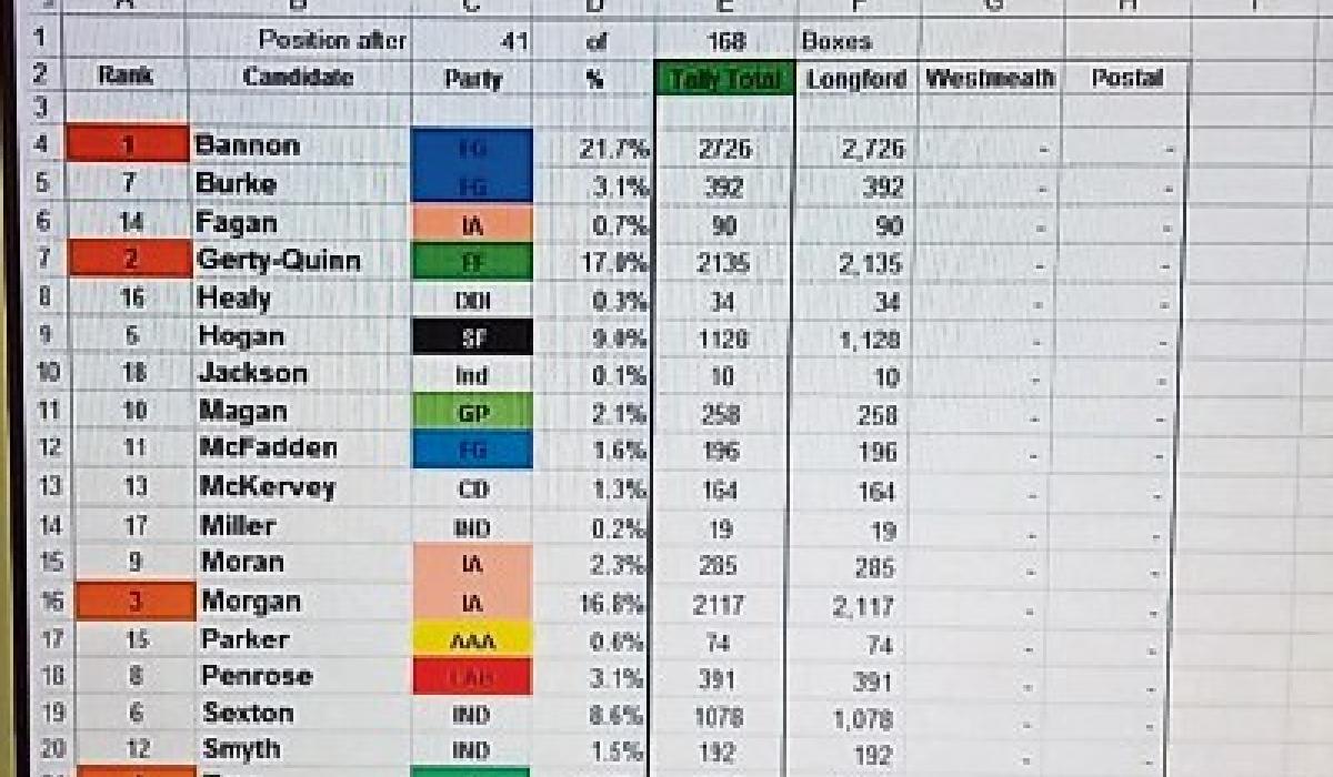 With 41 Longford boxes open at the count centre in Kenagh, James Bannon (FG) is leading the way, but could face a fight on his hands to retain his seat as a Fine Gael source claimed; “James needed to be at least 1,000 votes ahead before Westmeath boxes were opened and he's not”.