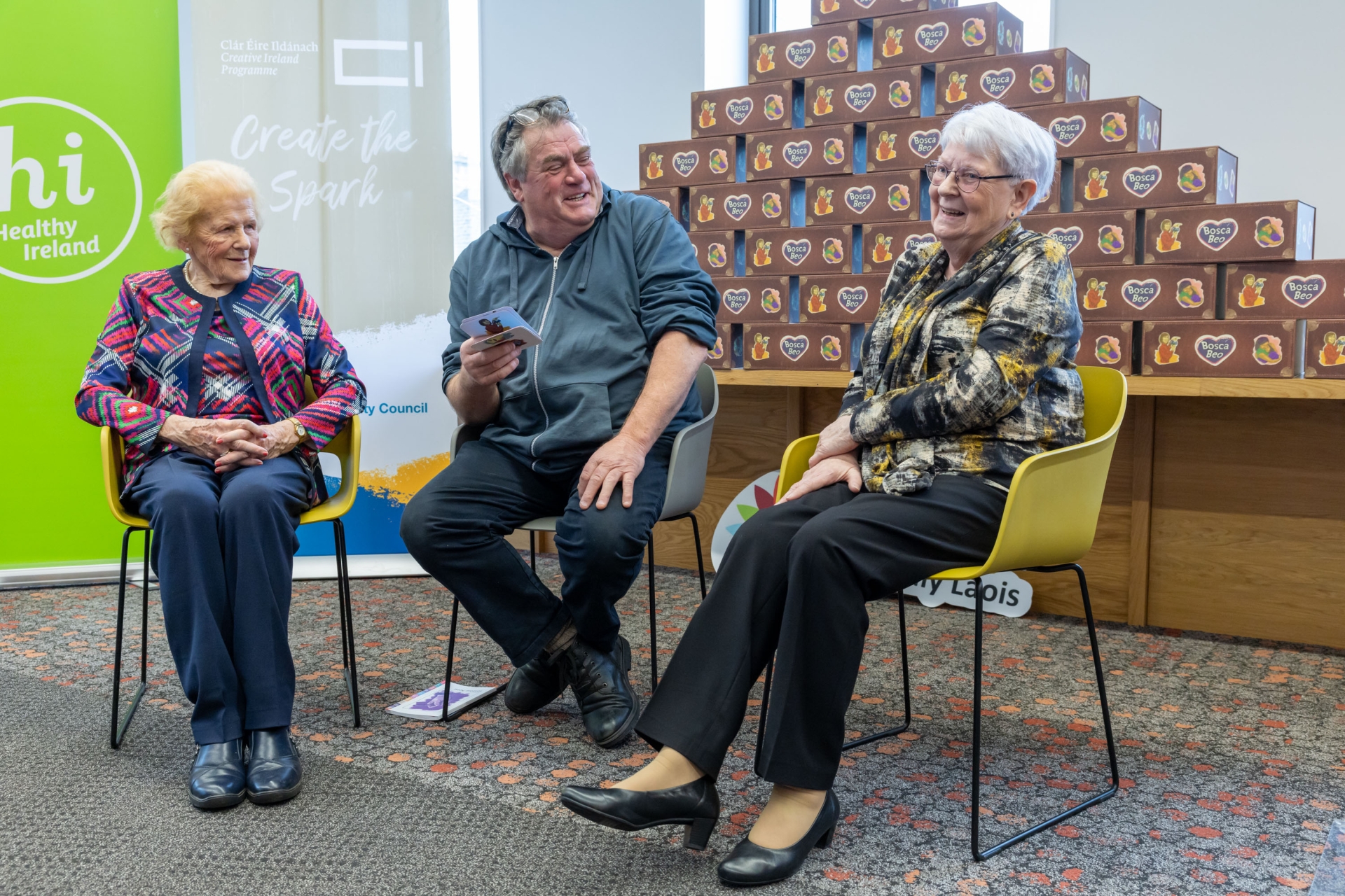 Anna May McHugh and Kitty Burkhill being interviewed by Mick Creagh at Portlaoise Library where Laois and Longford County Councils have unveiled Bosca Beo, an innovative project designed to help people record, collect, cherish, and share their life memories with loved ones.