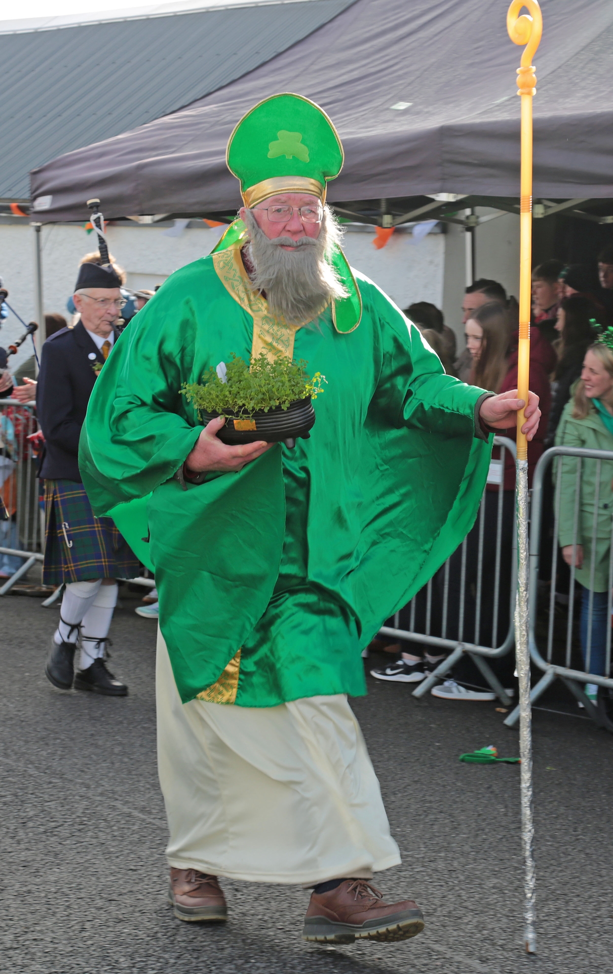 Caption: St Patrick arrived in Ballinamuck for the parade carrying a lovely bowl of shamrock Picture: Shelley Corcoran