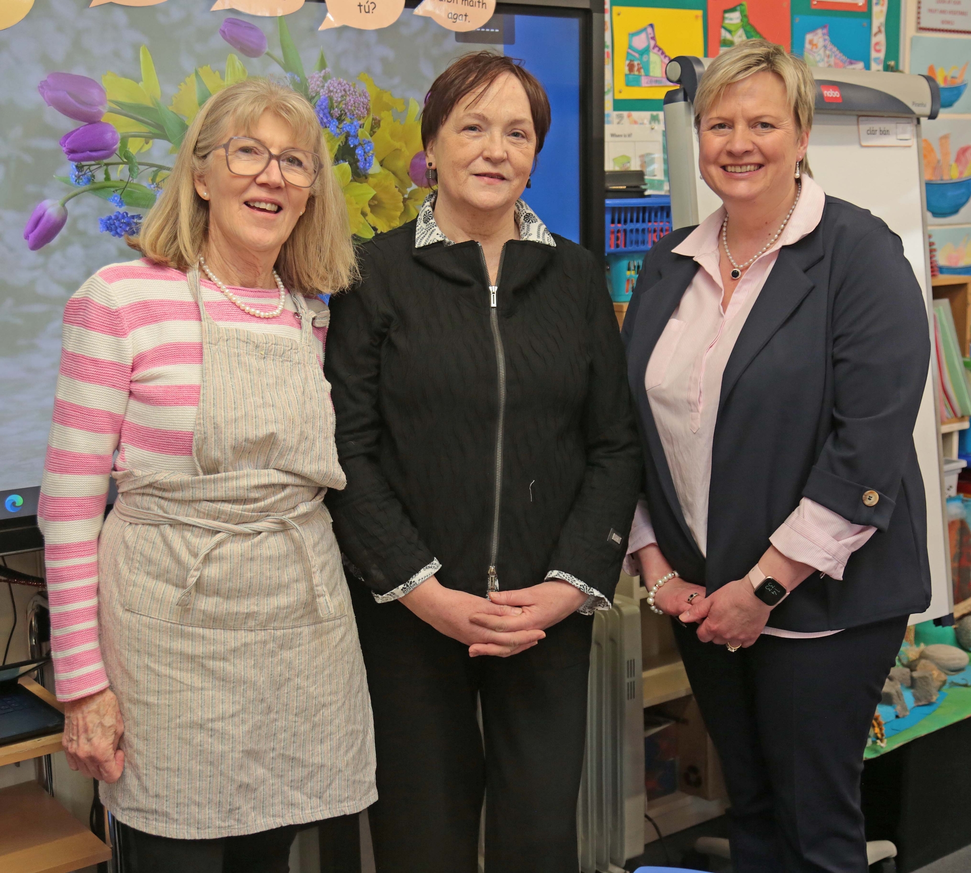 Caption: Cathy Vanvanren (SNA), Sandra Butler (teacher) and Gail Waters (principal) celebrating 140 years of St John's NS, Edgeworthstown