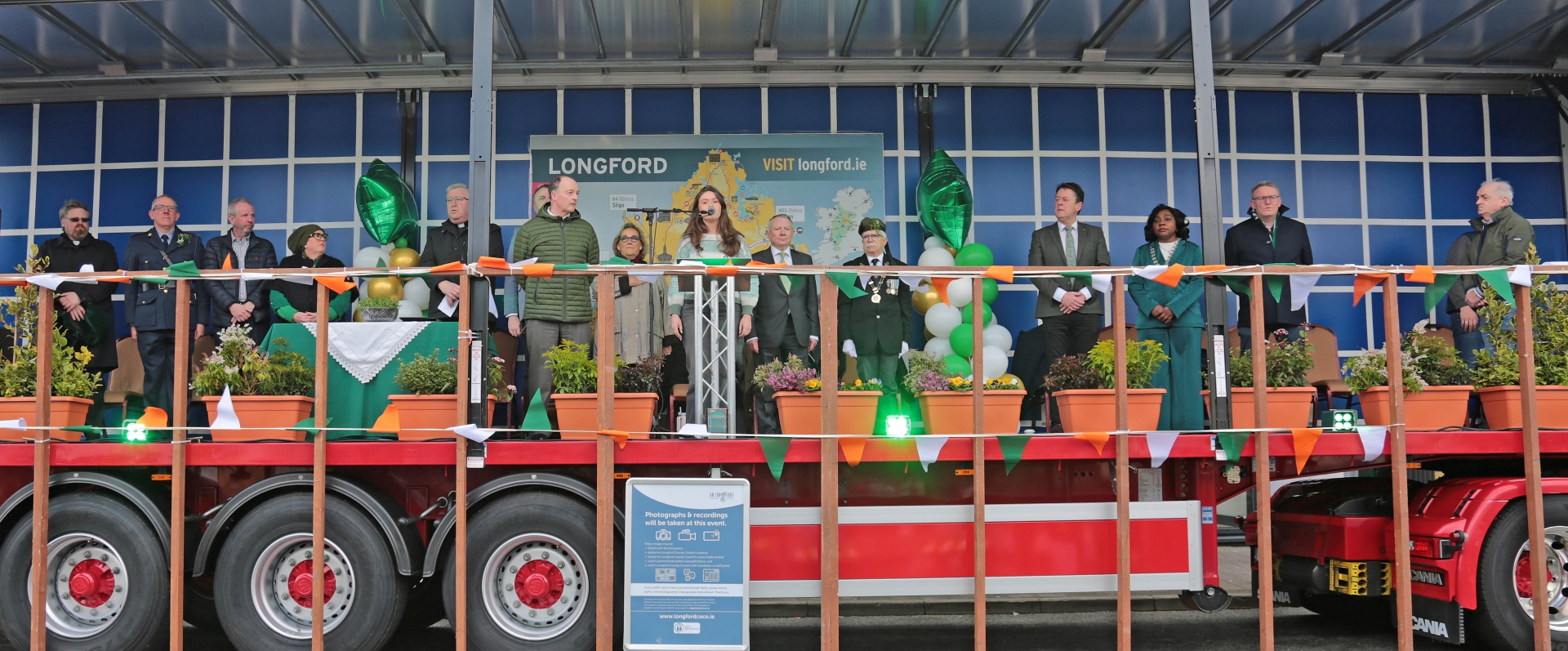 Caption: Amy Dolan singing the National Anthem from the review stand to mark the beginning of the Longford Town St Patrick's Day parade