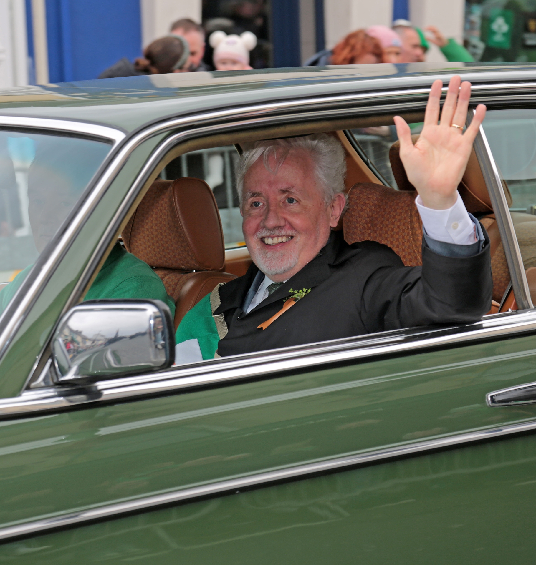 Caption: Longford St Patrick's Day Parade Grand Marshal Michael Keenan, Chairperson of Longford TidyTowns, waves to the crowd