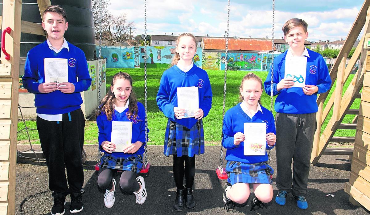 Callum Leddy, Mia Smith, Serena Stokes, Eileen Boyle and Donagh Callaghan from 6th class who helped in the making of Granapedia, the A to Z history booklet of Granard. Photo: Michelle Ghee.