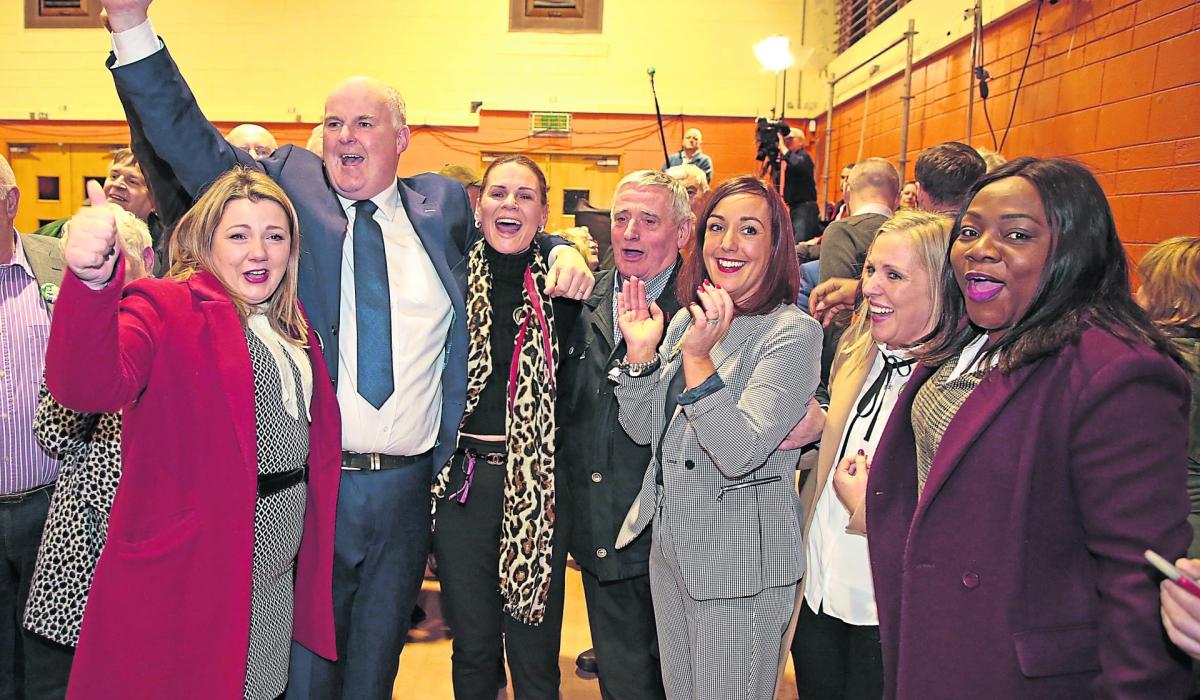 Remu Adejinmi (right) celebrates with party colleague Joe Flaherty and supporters following the latter's election to Dáíl Eireann earlier this month