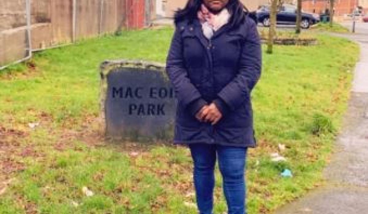 Fianna Fáil Cllr Uruemu Adejinmi stands at the entrance to MacEoin Park in Longford town this week
