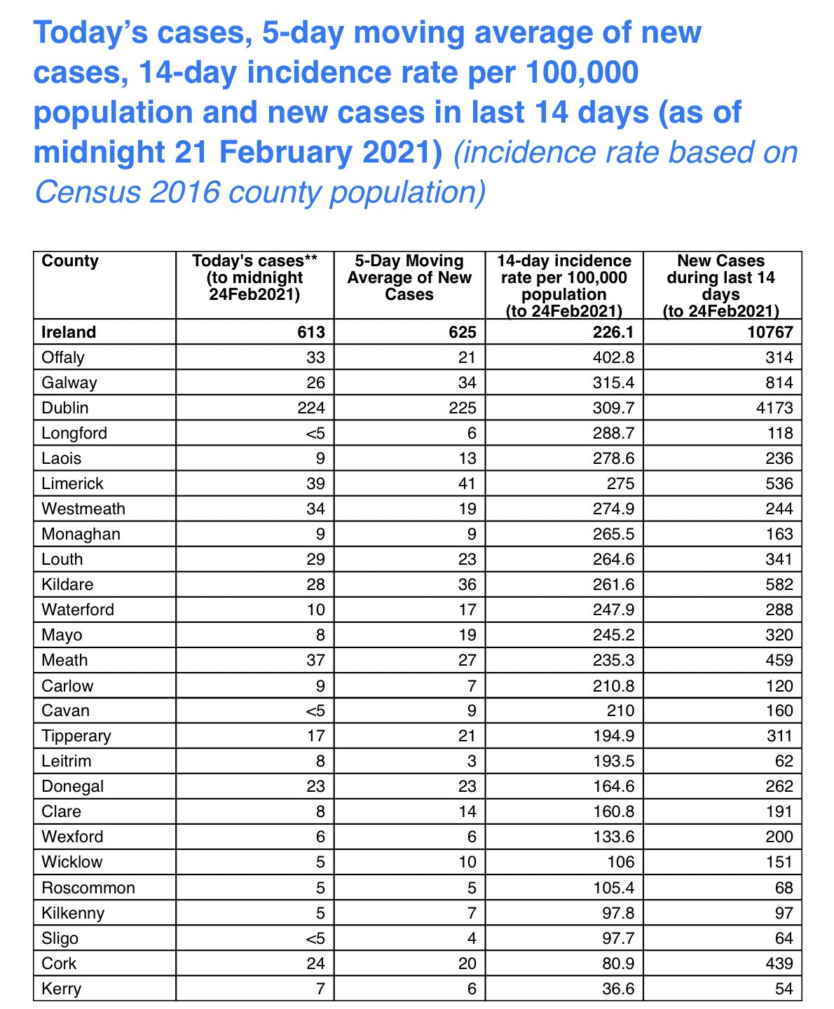 As of midnight, Wednesday 24th February, the HPSC has been notified of 613 confirmed cases of COVID-19. There is now a total of 217,478 confirmed cases of COVID-19 in Ireland.