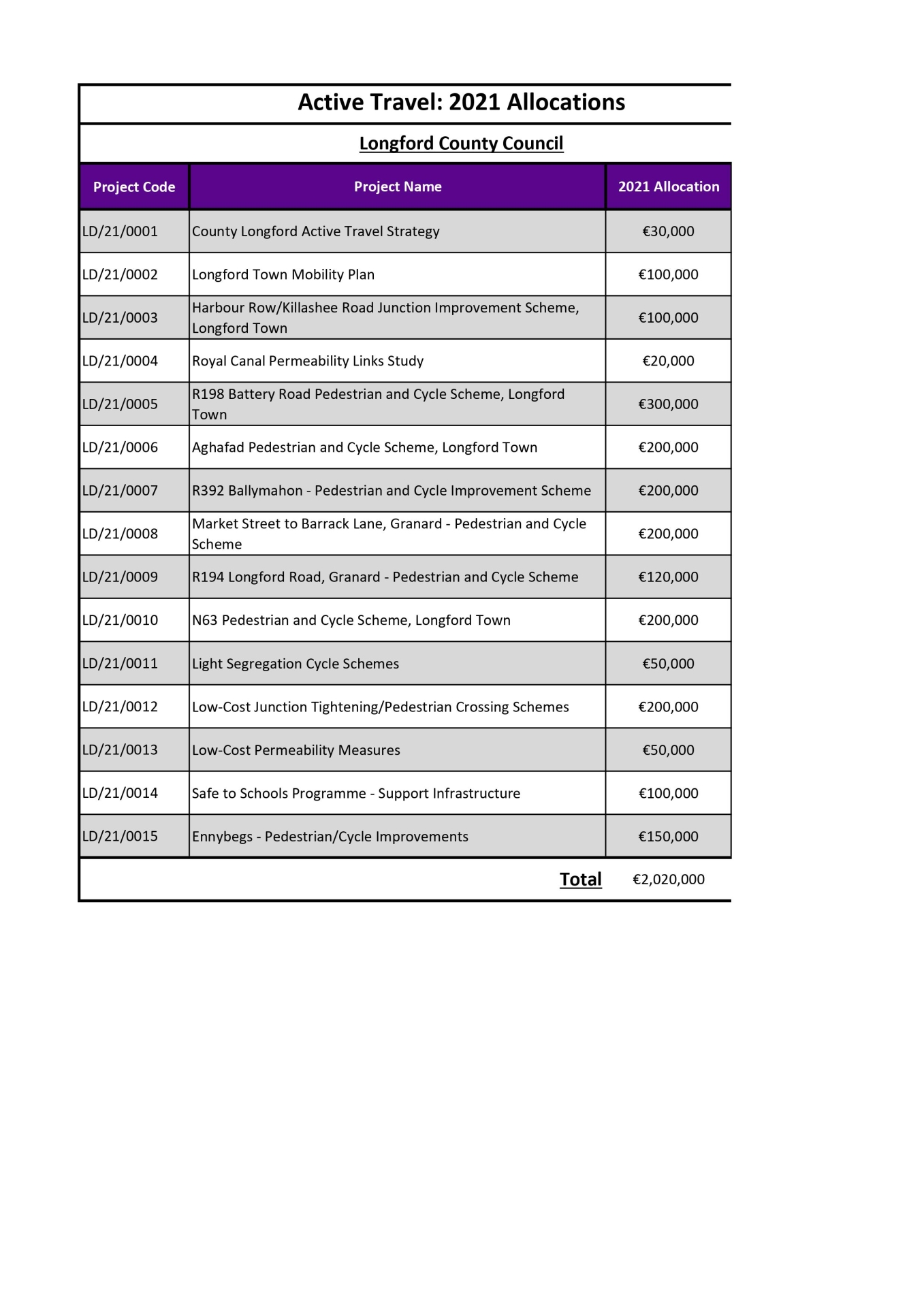 The National Transport Authority has announced an allocation of €2,020,000 for cycling and walking infrastructure projects in county Longford.