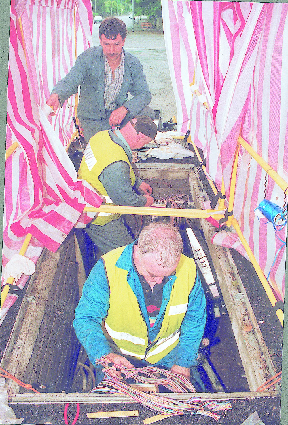 Caption: Robbers cripple the Town phone system - The telephones of nearly 12 homes in Longford Town and suburbs were shut off after thieves cut the telephone lines in an attempt to short circuit an alarm system. Repair men worked throughout the day and into the night to repair the system. Pictured above are Telecom men John McCarthy, Killoe; Finbar Holmes, Tarmonbarry and Philip Butler, Abbeyshrule