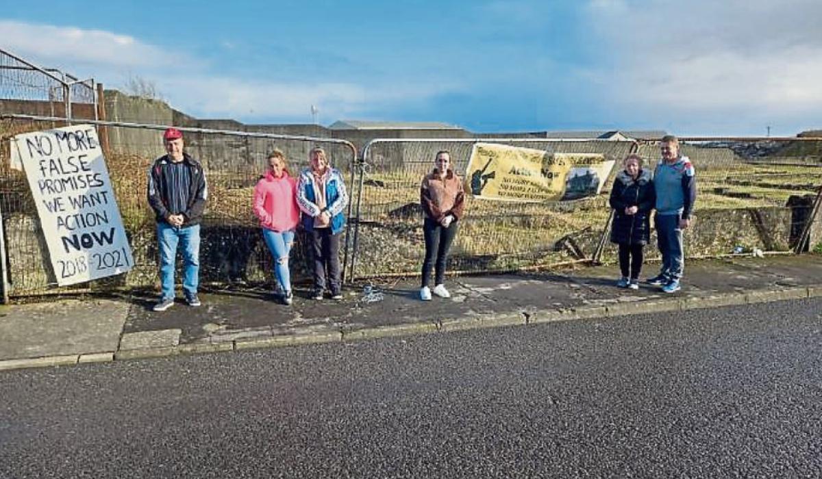 Local residents standing in front of a posters fastened onto a cordoned off section of barren land, left to right: Kevin Small, Tracey Stokes, Bernie Reilly, Caroline Kelly, Rosemary McQuillan and Joe
