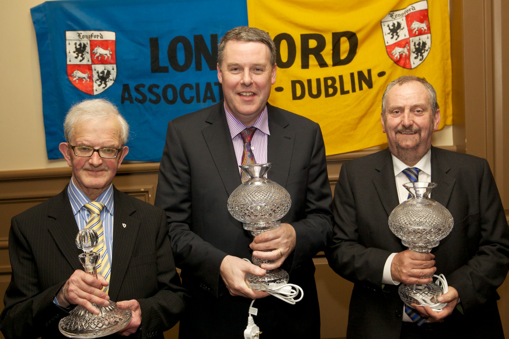 Caption: Hall of Fame Winner, Jude Flynn, and joint winners of the Person of the Year Award, 2012, Ciaran Mullooly and John Donlon, at the Longford Association in Dublin, Annual Dinner Dance, in Moran's Red Cow Hotel, Naas Road, Dublin
