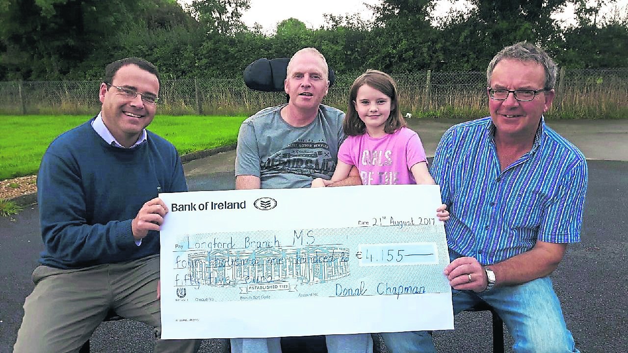 Caption: The late Donal Chapman pictured in 2017 after he undertook a parachute jump to raise funds for the Longford Branch of Multiple Sclerosis. Donal, alongside his daughter Ríona and friend Dominic McGrath (who sponsored the jump) is pictured here presenting a cheque for €4,155 to Donal Casey, Chairperson Longford Branch of MS.