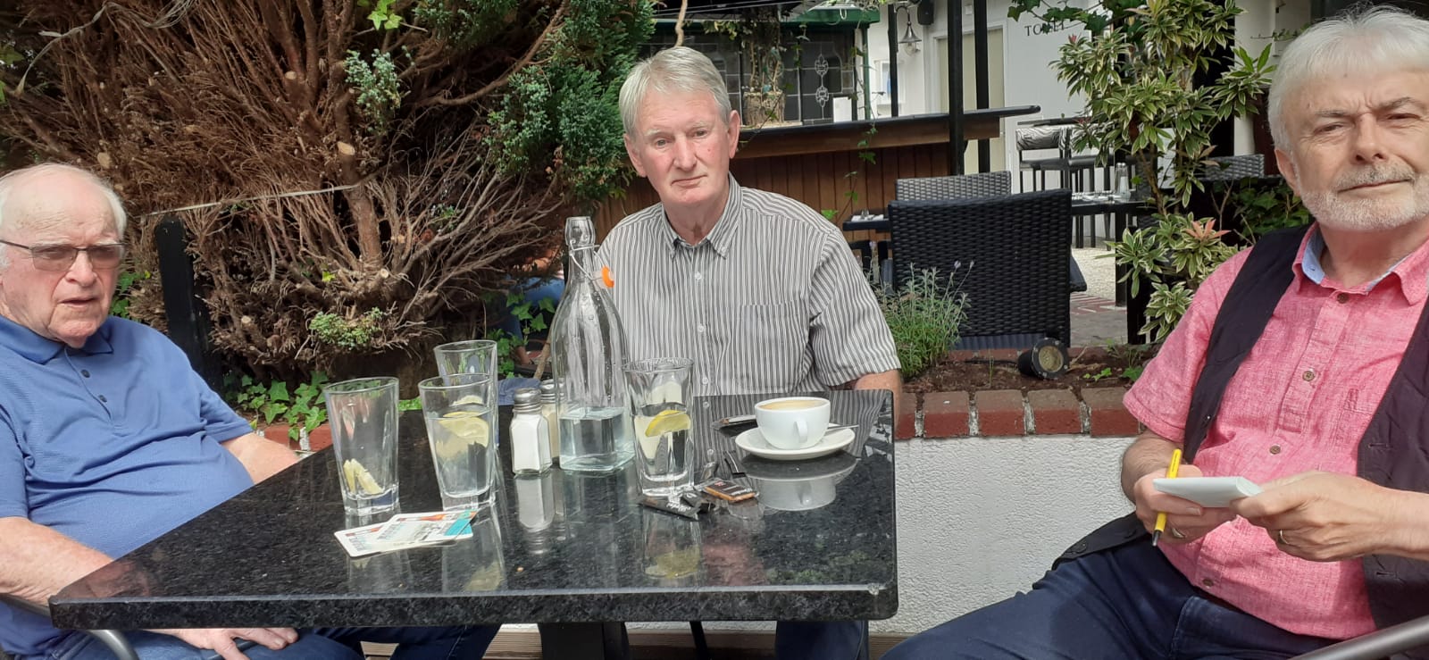 Over refreshments on a beautiful sunny afternoon we covered quite a range from the frivolous to the serious, which included GAA and past games and players, local characters past and present, a few good yarns – and we even touched on existential matters, though not for too long; the craic was too good!