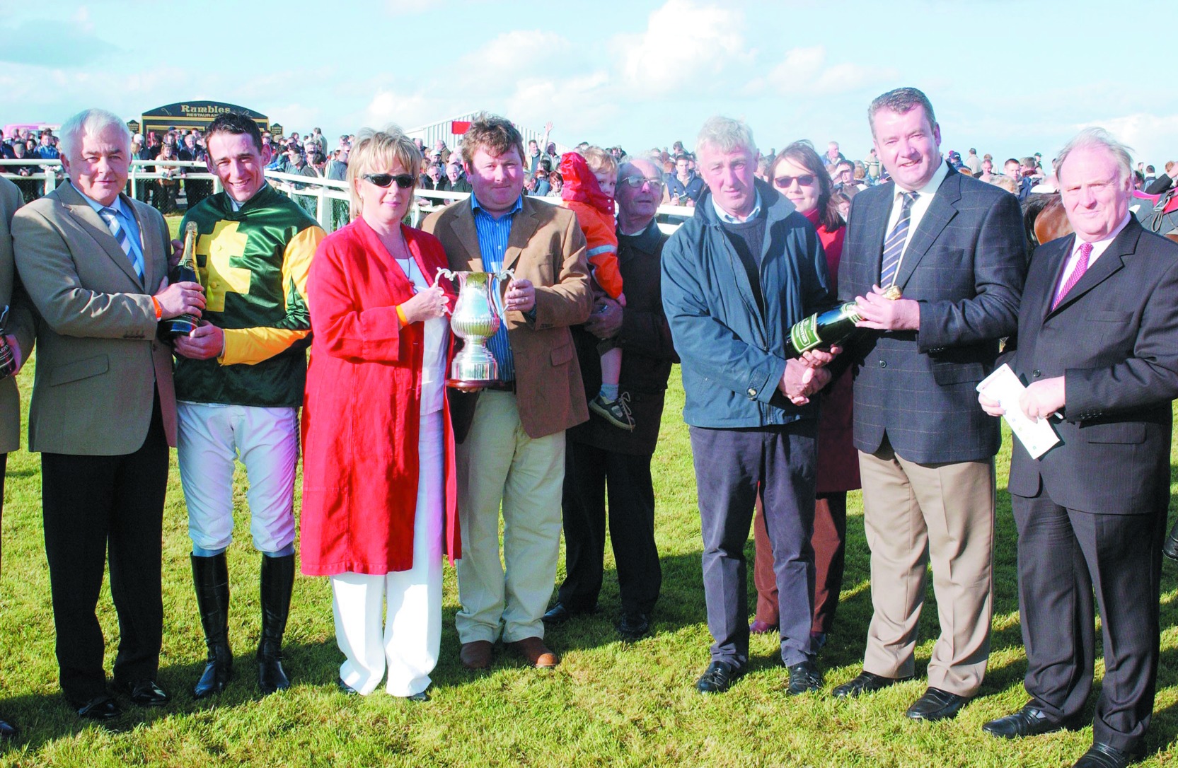 Caption: Regal Son impresses at Kilbeggan Races – The Naughton family from Ardagh were in Kilbeggan to see their horse Regal Son storm home to win the Sean Hughes Memorial Cup. The horse is trained by Pat Doyle. Pictured at the presentation ceremony were from left: Dave Russell, Ms Hughes Mulligan, Park Hotel; Cyril Naughton, Sean Naughton, Pat Doyle, Joan Naughton, Con Gilsenan and Jimmy McDonnell