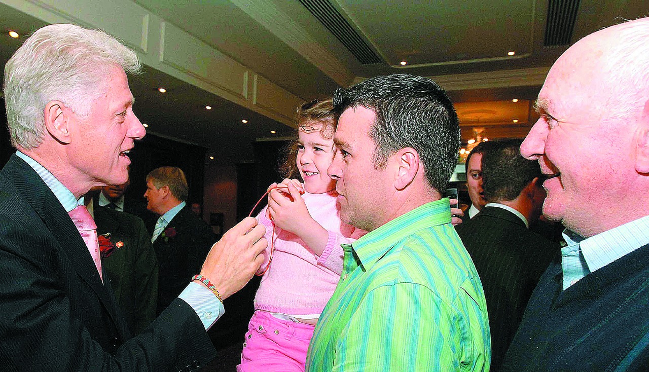 Caption: Former President of the US Mr Bill Clinton is pictured here talking to little Lauren Fox, a daughter of Ballinalee native Gerry Fox, Grandfather Jimmy Fox is pictured in the foreground