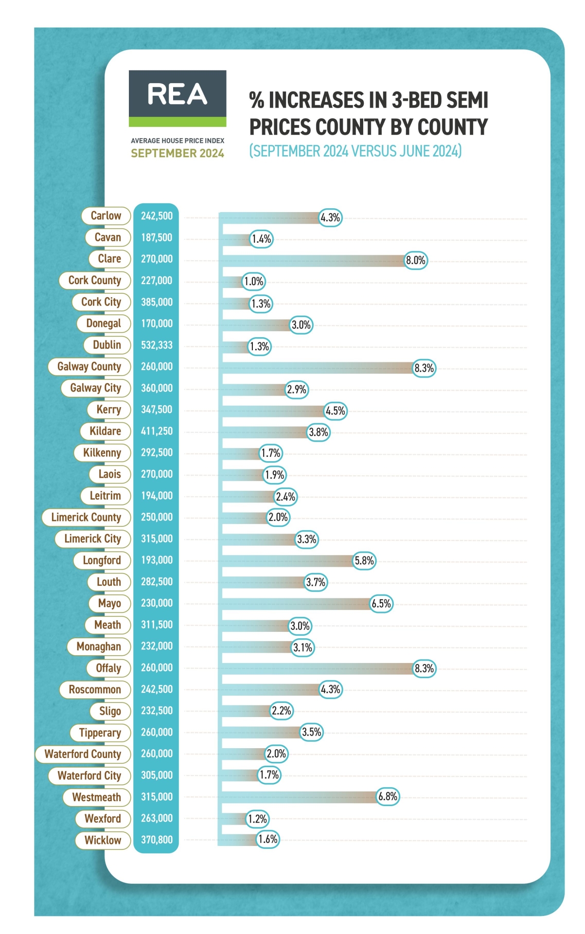 The REA Average House Price Index concentrates on the sale price of Ireland's typical stock home, the three-bed semi, giving an accurate picture of the second-hand property market in towns and cities countrywide.
