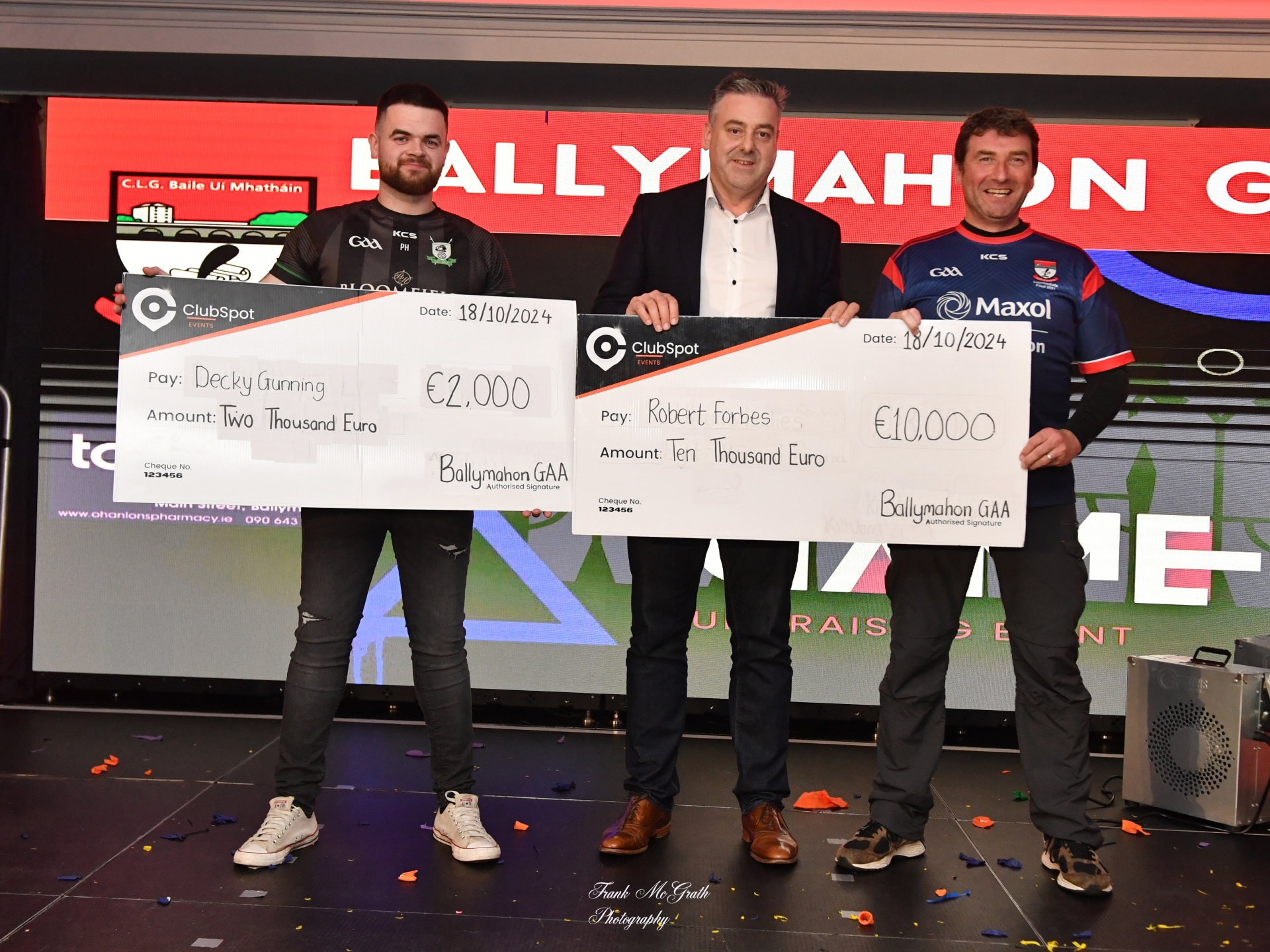 Caption: Kieran O'Hanlon of Total Healthcare Pharmacy and Ballymahon GAA main sponsor presenting first prize of €10,000 to the winner of the 'Quid Games' fundraiser show to Robert Forbes whose charity, The Irish Heart Foundation will benefit to the tune of €8,000. Also in photo is runner up Decky Gunning from Miltown, Westmeath who won €2,000 Pictures: Frank McGrath