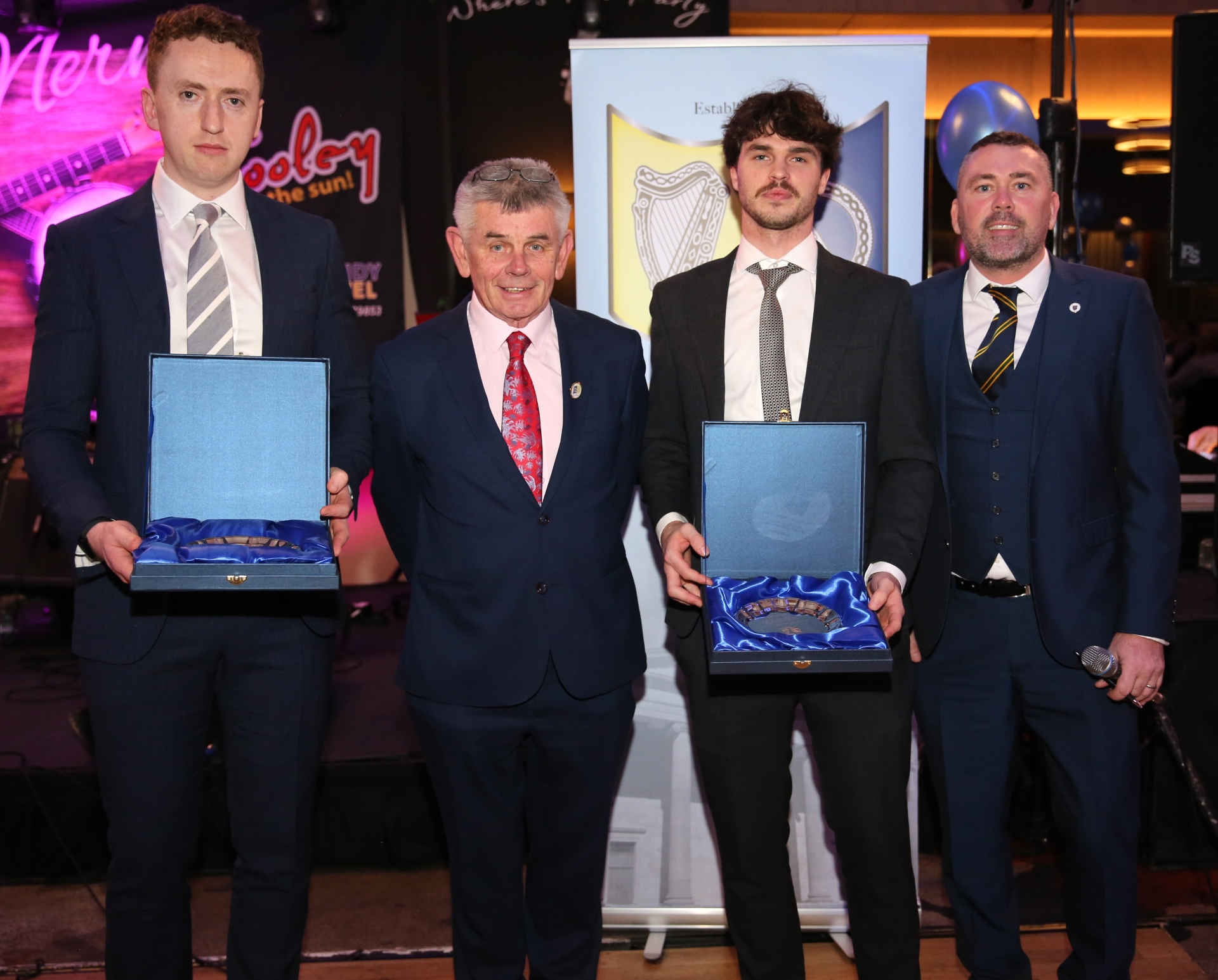 Caption: Cllr Martin Skelly making a presentation to Sean McCabe and Euan Finneran from Tara GFC London who won The All Britain Club Championship along with PRO Ciaran McGann
