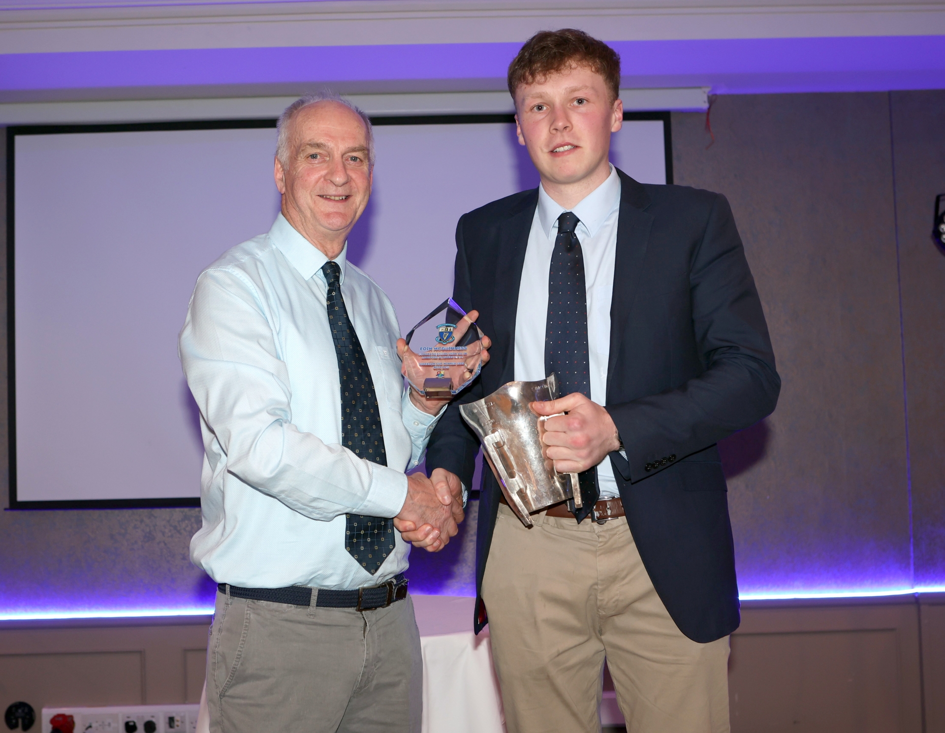 Caption: Kieran Dalton makes a presentation to Slashers goal keeper Eoin McGuinness. Eoin was No.1 on the DCU college team who won the Sigerson Cup recently.