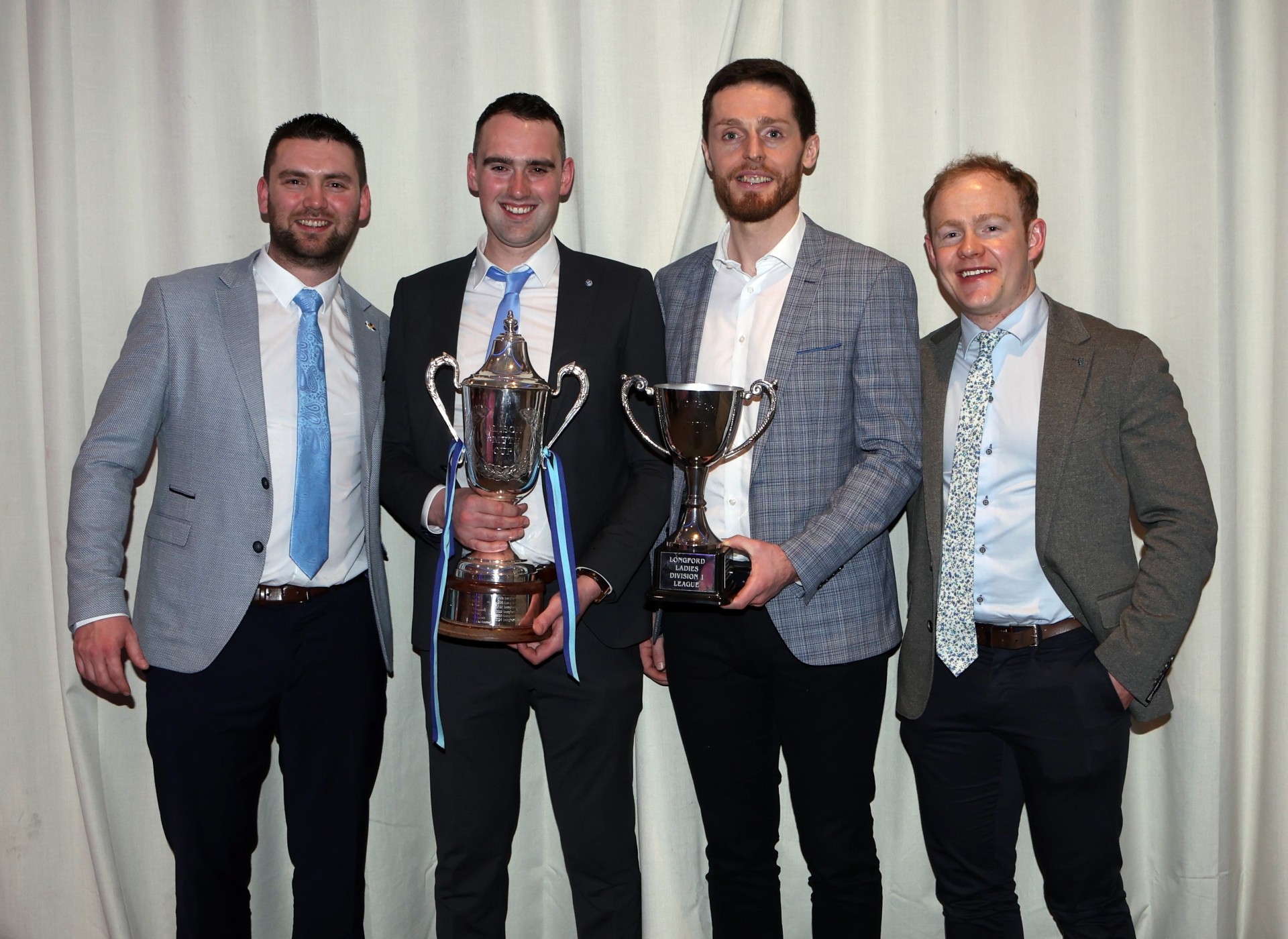 Caption: Longford Slashers Ladies senior management team Aaron Flaherty, Manager Ciaran Farrell, Garreth McQuaid & Paddy Farrell with the Alison Smyth and Div 1 League cups.