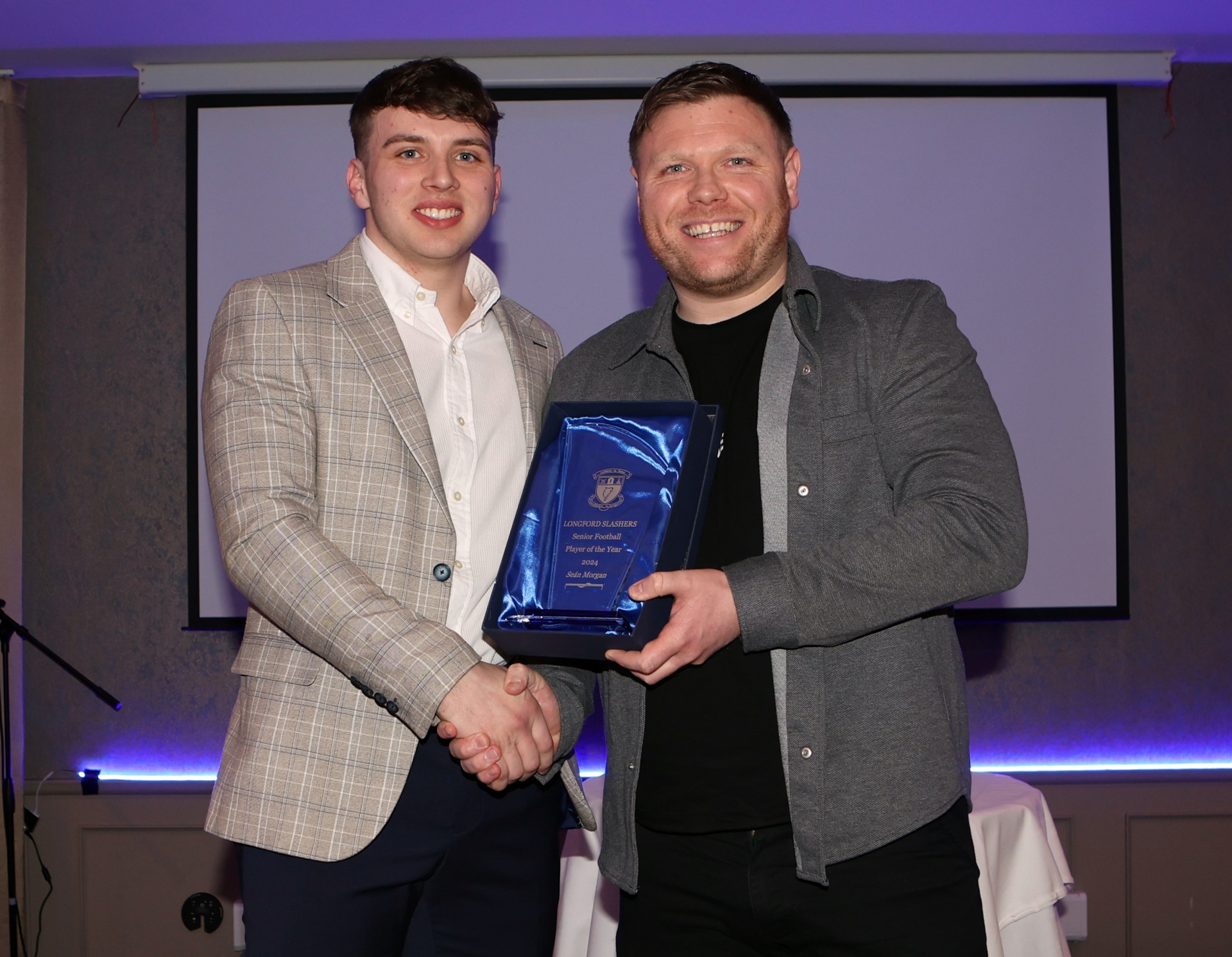 Caption: Sean Morgan receives the Slashers senior player of the year award from new Slashers senior manager Conor Clarke.