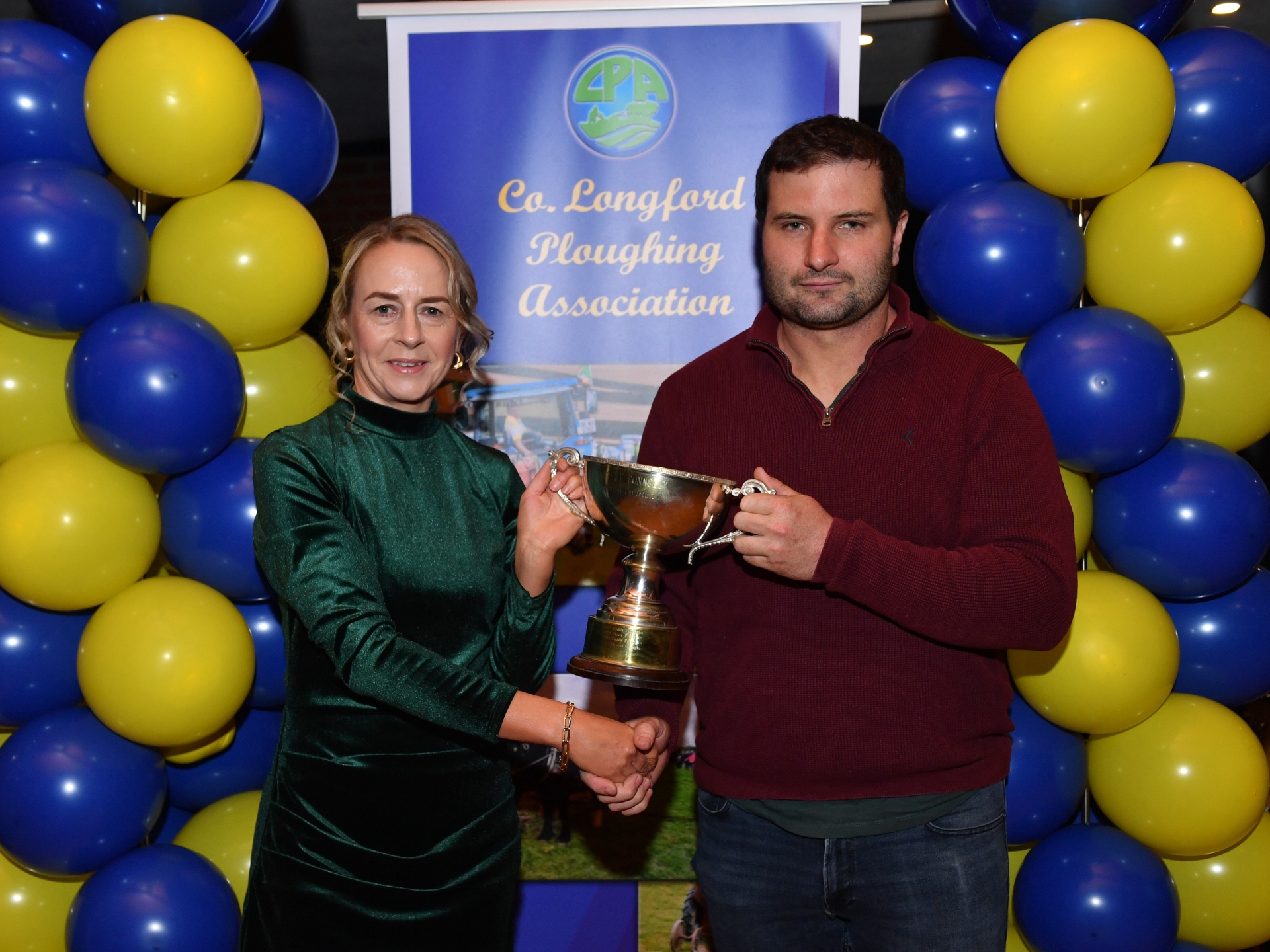 Caption: Sean Monaghan receiving his cup for 2nd place in the senior plough, Longford from Cynthia Geelan Cruise