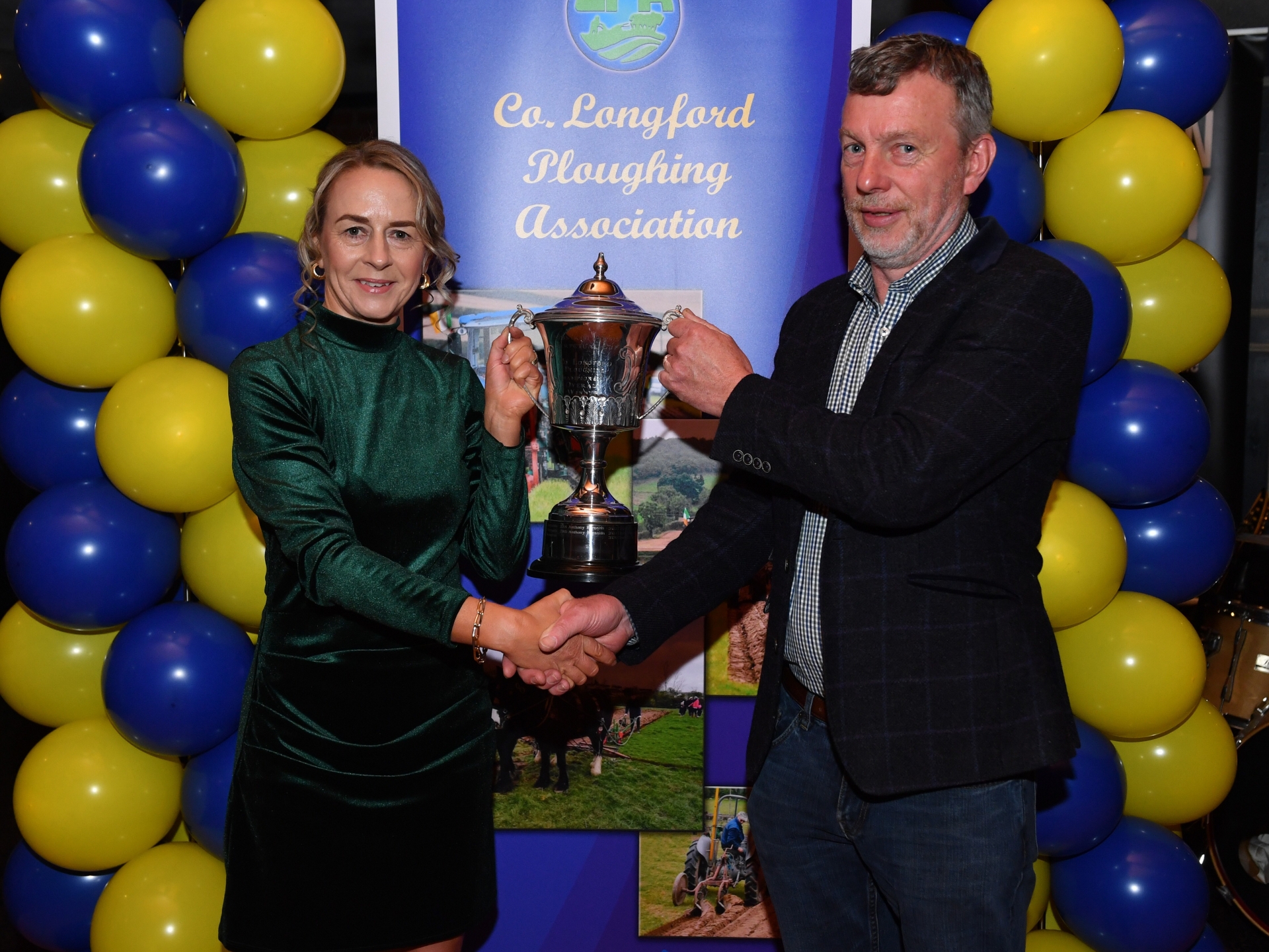 Caption: Cynthia Geelan Cruise presenting Anthony Reynolds with the cup for 1st place in the Senior conventional plough (Longford confined)