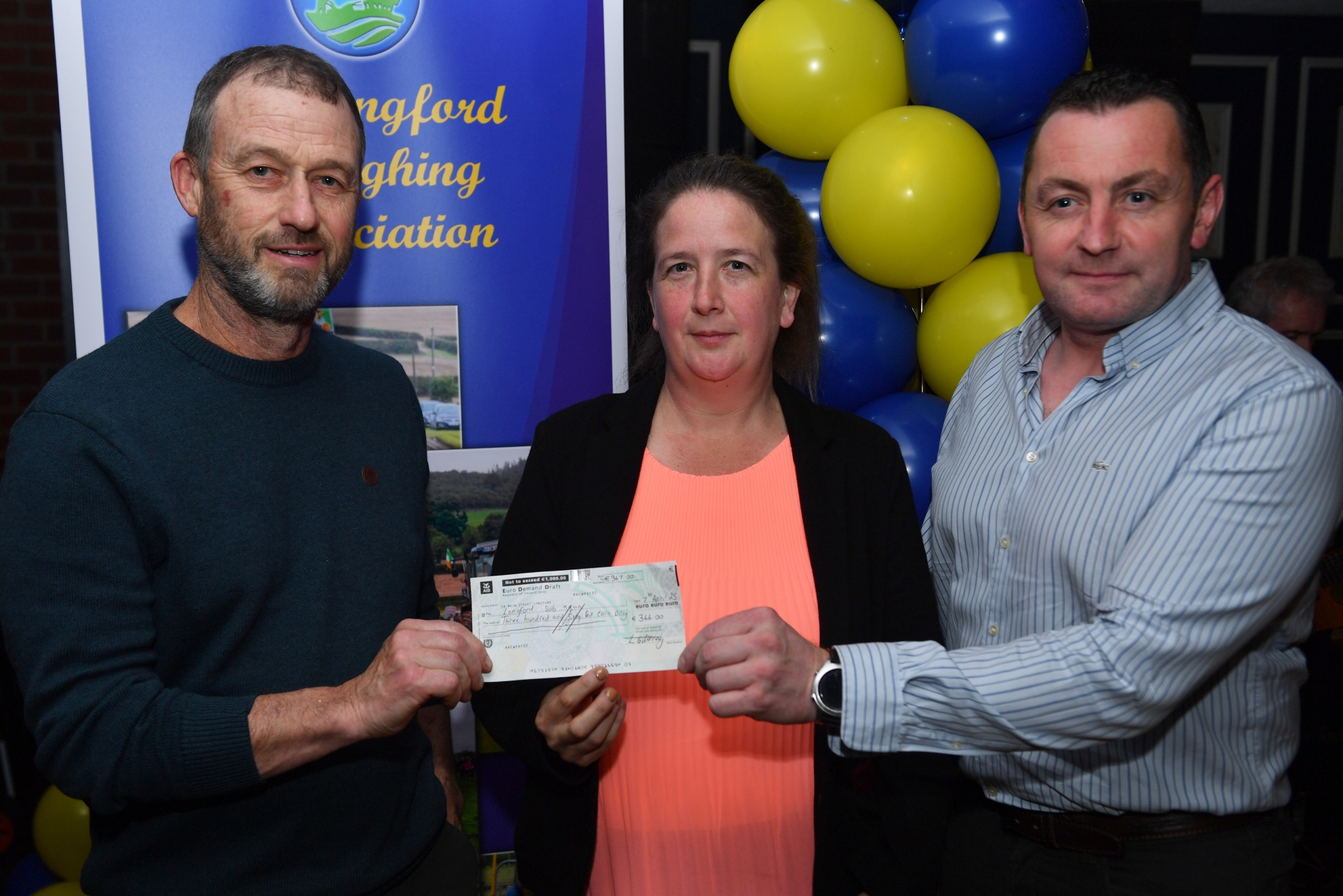 Caption: Harriet Stewart presenting cheque to James Cahill and John Bidrick of the County Longford Scuba Divers sponsorship proceeds from the presentation night