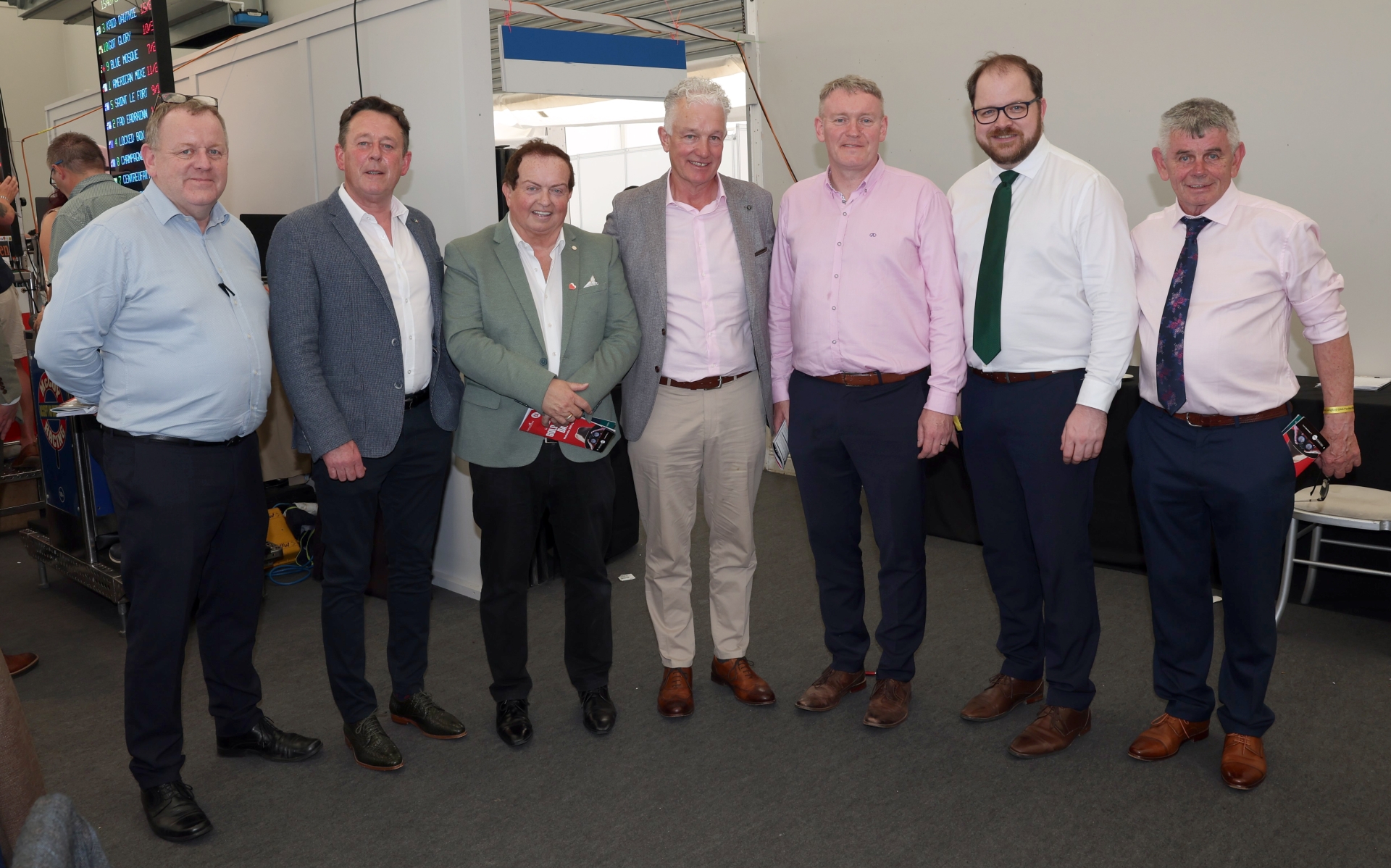 Caption: 21st Longford GAA Raceday at Punchestown 2025. Longford GAA Secretary Peter O'Reilly, Cllr Gerry Hagan, Guest MC Marty Morrissey, Frank Kiernan, Deputy Micheál Carrigy, Longford GAA PRO Colm Murray & Raceday Chairperson Cllr Martin Skelly. Picture: Syl Healy