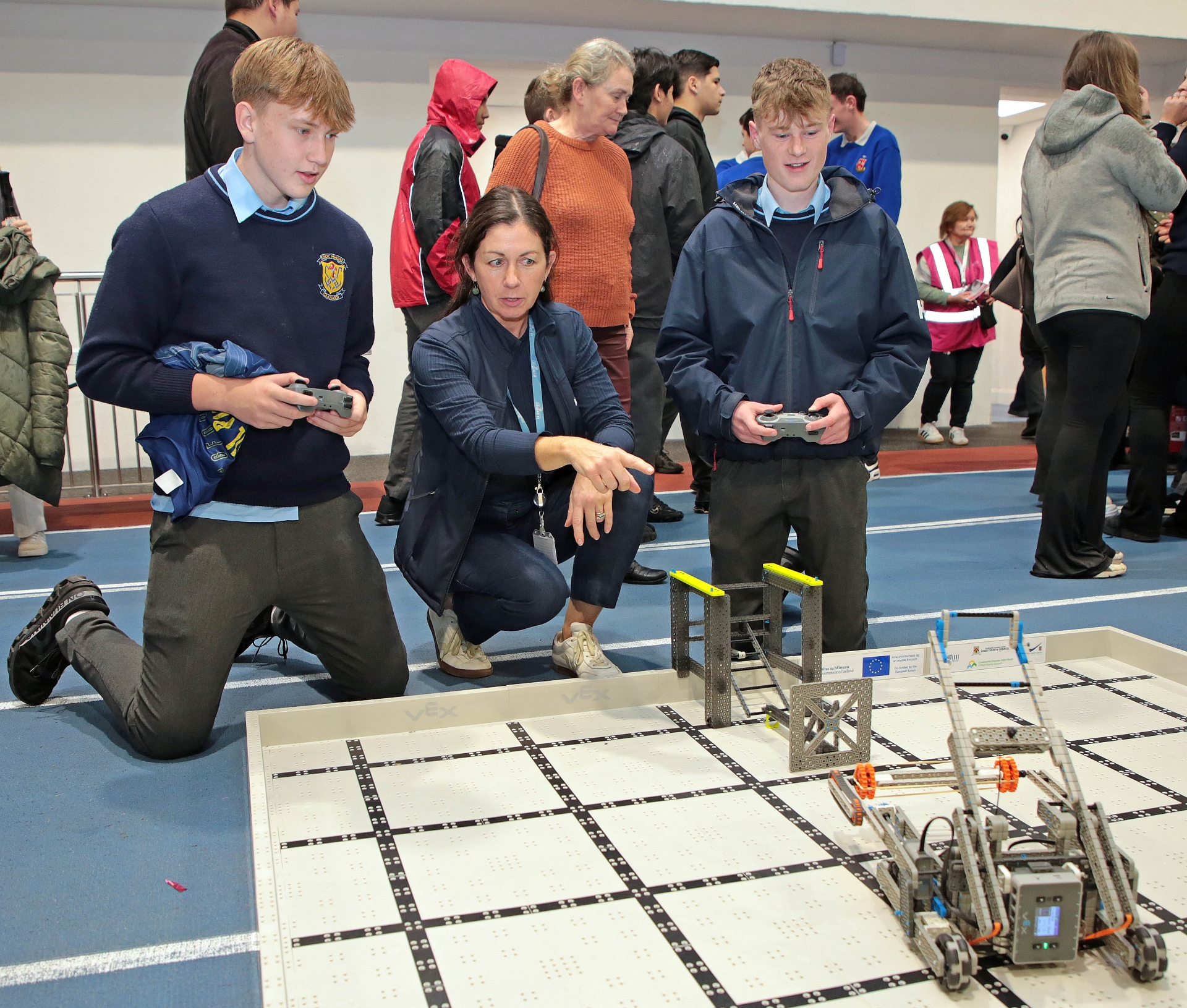 Caption: Students from Cnoc Mhuire Granard learn about the VEX unit from Siobhan Grealy STEM Engagement Officer during the Community Safety & Wellbeing Expo