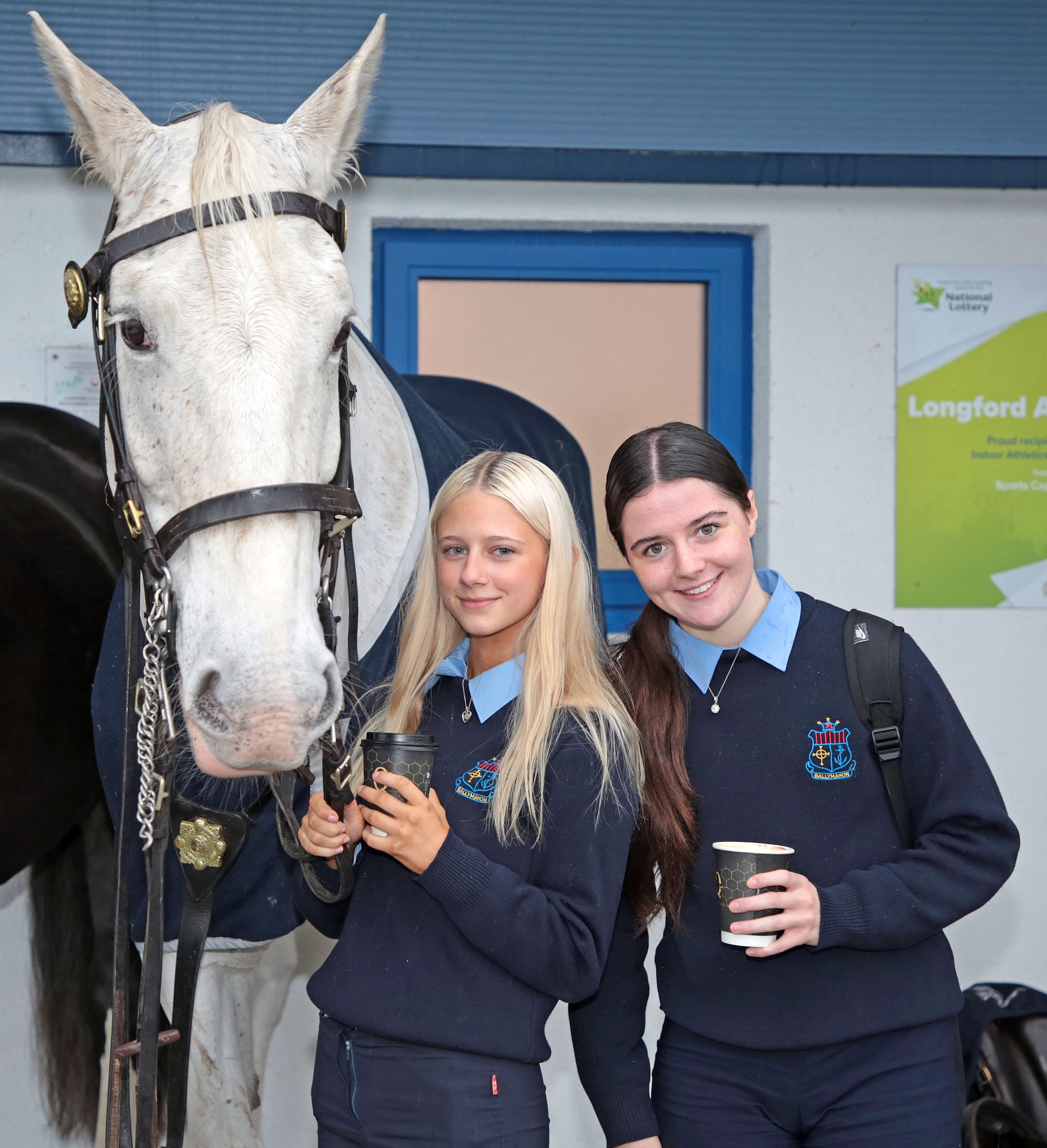 Caption: Students from Mercy Ballymahon with the Garda Horse Unit at the Community Safety & Wellbeing Expo in Longford Athletics Club
