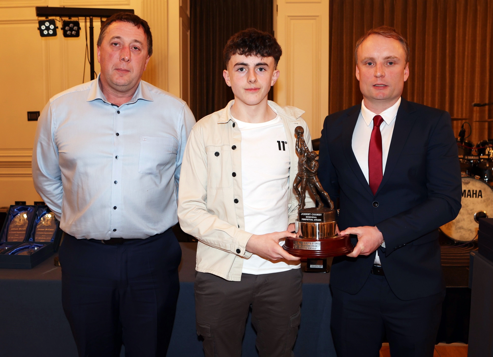Caption: Fr Manning Gaels, St Vincent's Minor club & St Helen's Ladies presentation and social night. U14 player of the year Darragh Murphy receives the Johnny Cooney memorial trophy from Ciaran Cooney with St Vincent's Chairperson Derek McKeon Picture: Syl Healy