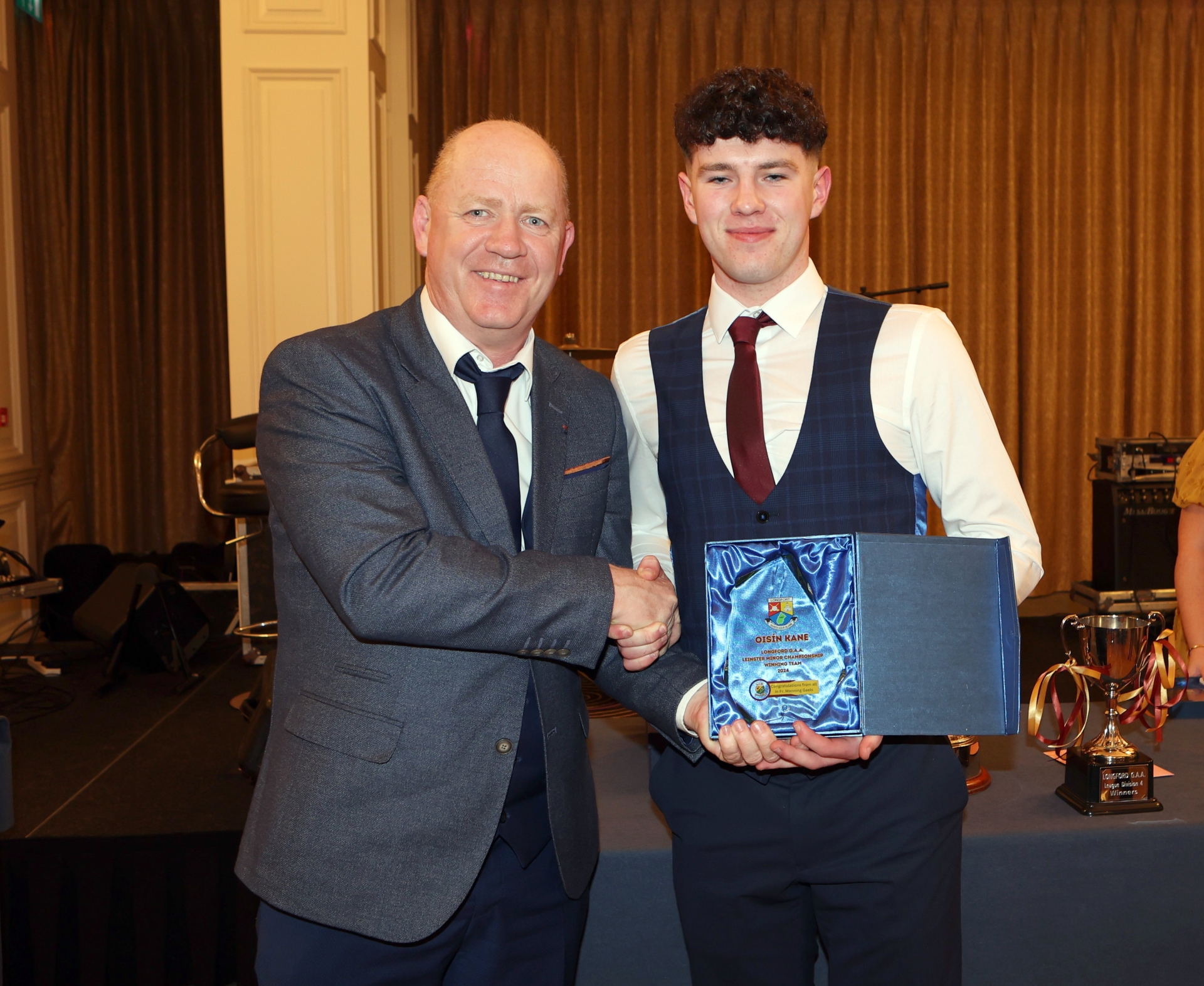 Caption: Longford GAA Chairperson Derek Fahy presents an award to 2024 Longford Minor player Oisin Kane