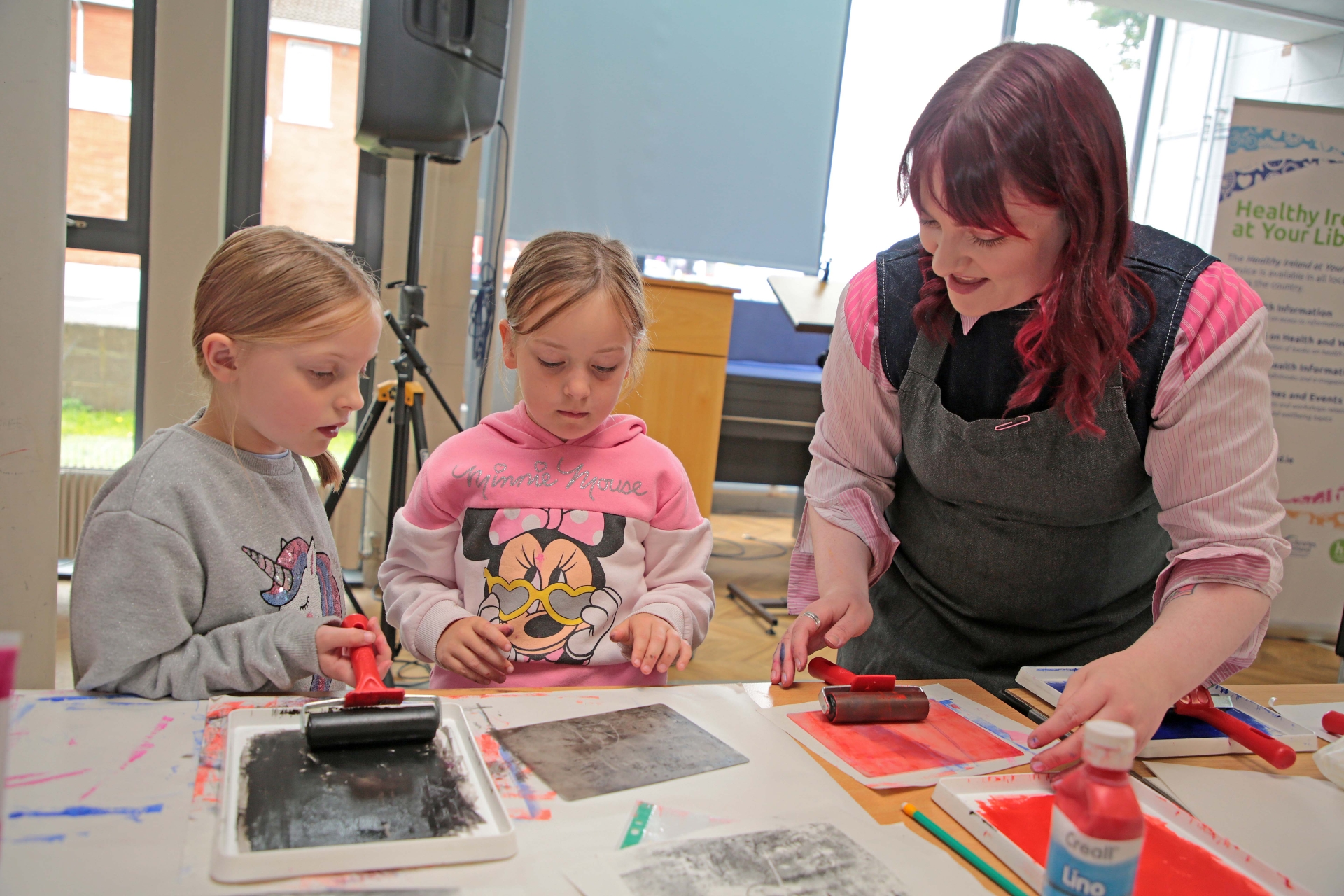 Caption: Longford Library, Print Making; Leah Doris, Chloe Creegan and Sophie Carroll Hunt