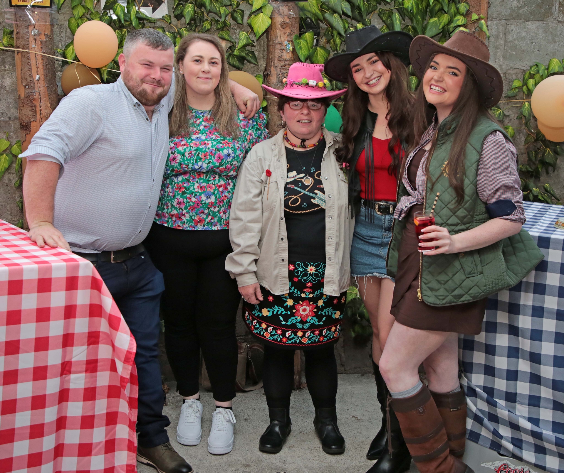 Caption: Calum O'Hara, Roisin McPhillips, Sarah Small, Amy McGlynn and Niamh Cassidy enjoying the Granard Show Fundraising Barn Dance on Saturday in John Vs Granard. The gig featured a jiving competition, barbeque, prize for the Best Dressed Cowgirl / Cowboy, raffle and an auction.
