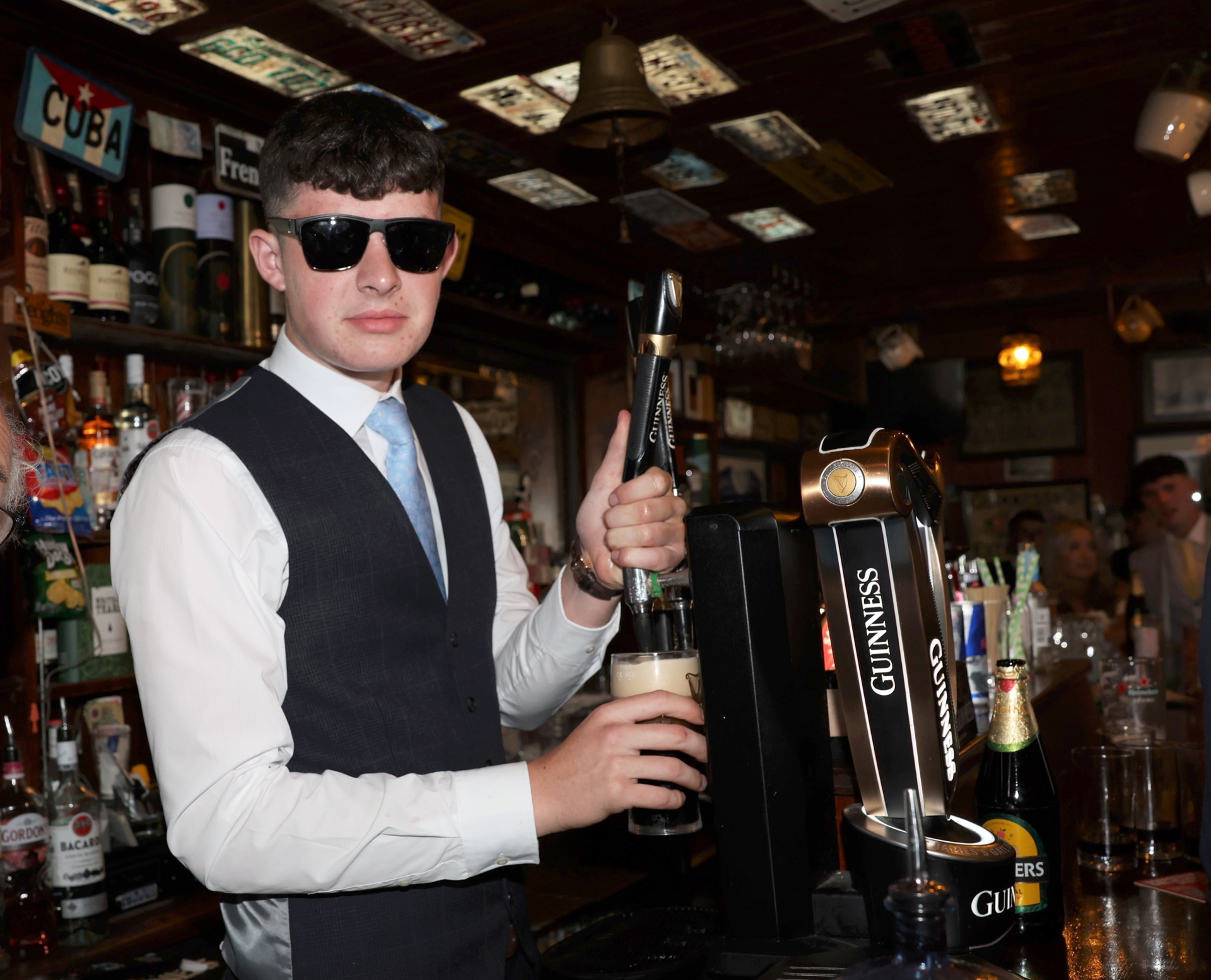 Caption: Moyne Community School Graduation night. Even on his Grad night Jack Dobson helps out in Murtagh's Bar, Arva. Photo: Syl Healy