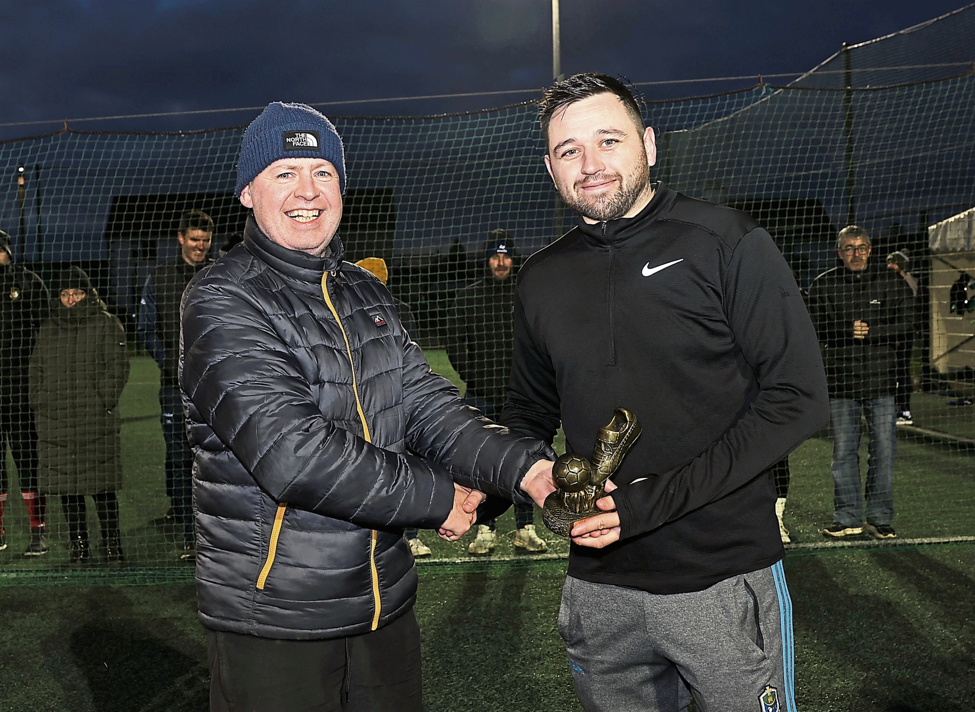 Caption: Aaron Wyse presents the Top Scorer Award to David Rooney