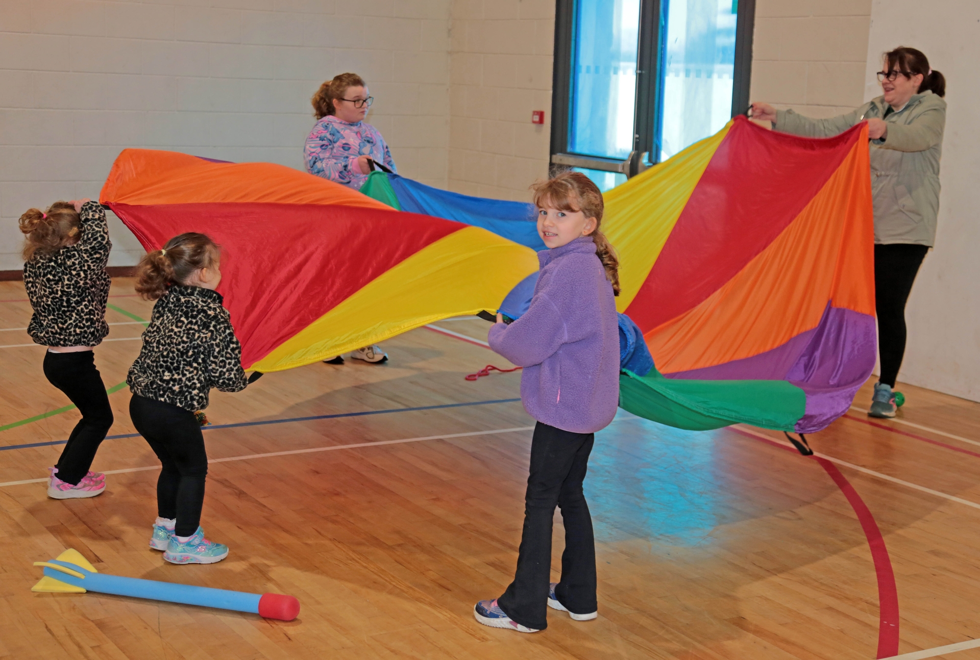 Caption: Having fun with a parachute at the official launch of Drumlish Inclusive Sports Club on Saturday last. Picture: Shelley Corcoran