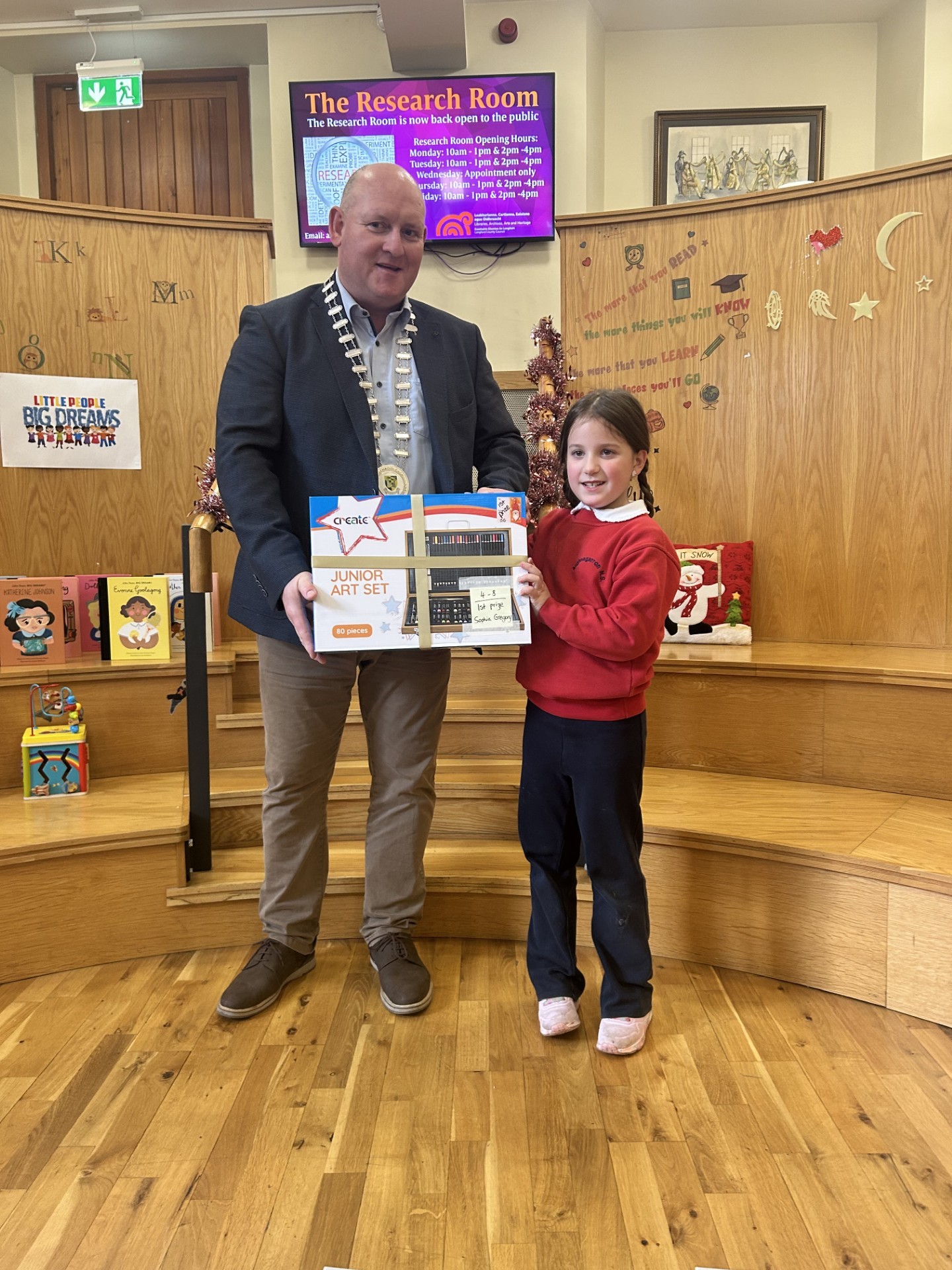 Caption: Longford Library Services‘Design a Bookmark’ competition: Sophia Gregory, 1st in the 4-8 category, Granard Branch Library pictured receiving her prize from Cathaoirleach of the Granard Municipal District Cllr Turlough McGovern