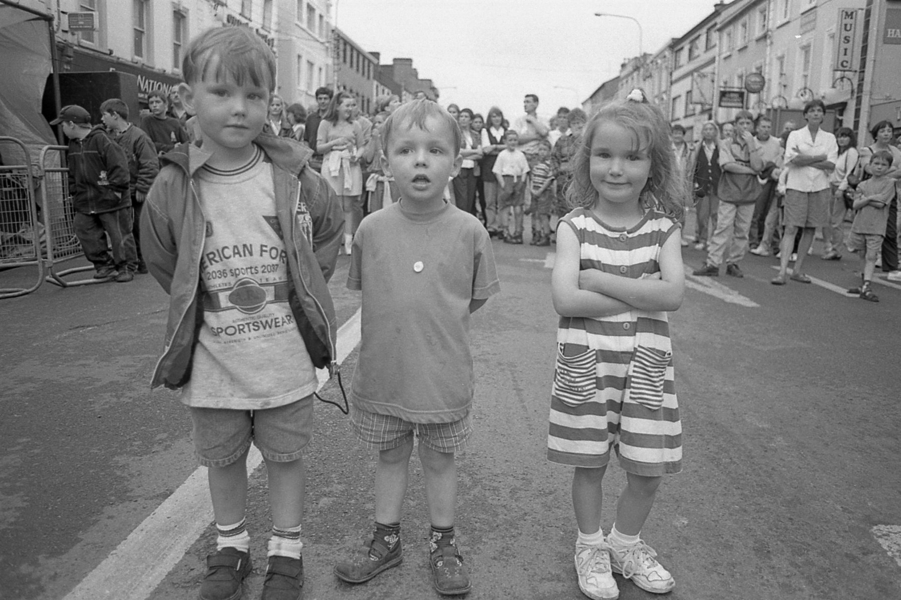 CAPTION: Out in front and keeping an eye on the happenings at Longford Summer Festival during the official opening in July 1996 were Daniel Maguire from Longford with visitors Conor Hanley and Shena Hourihan PICTURE: JOE MCDONAGH