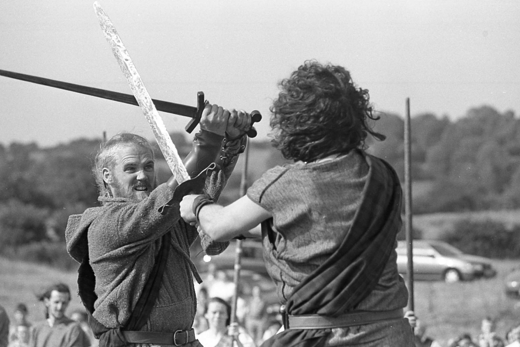 CAPTION: Two warriors clash in a battle re-enactment from a battle in 1315 in Granard. The re-enactment was performed in August 1996 by a group known as the Society of Irish Re-enactors (SIR) who featured in the film “Braveheart” PICTURE: JOE MCDONAGH