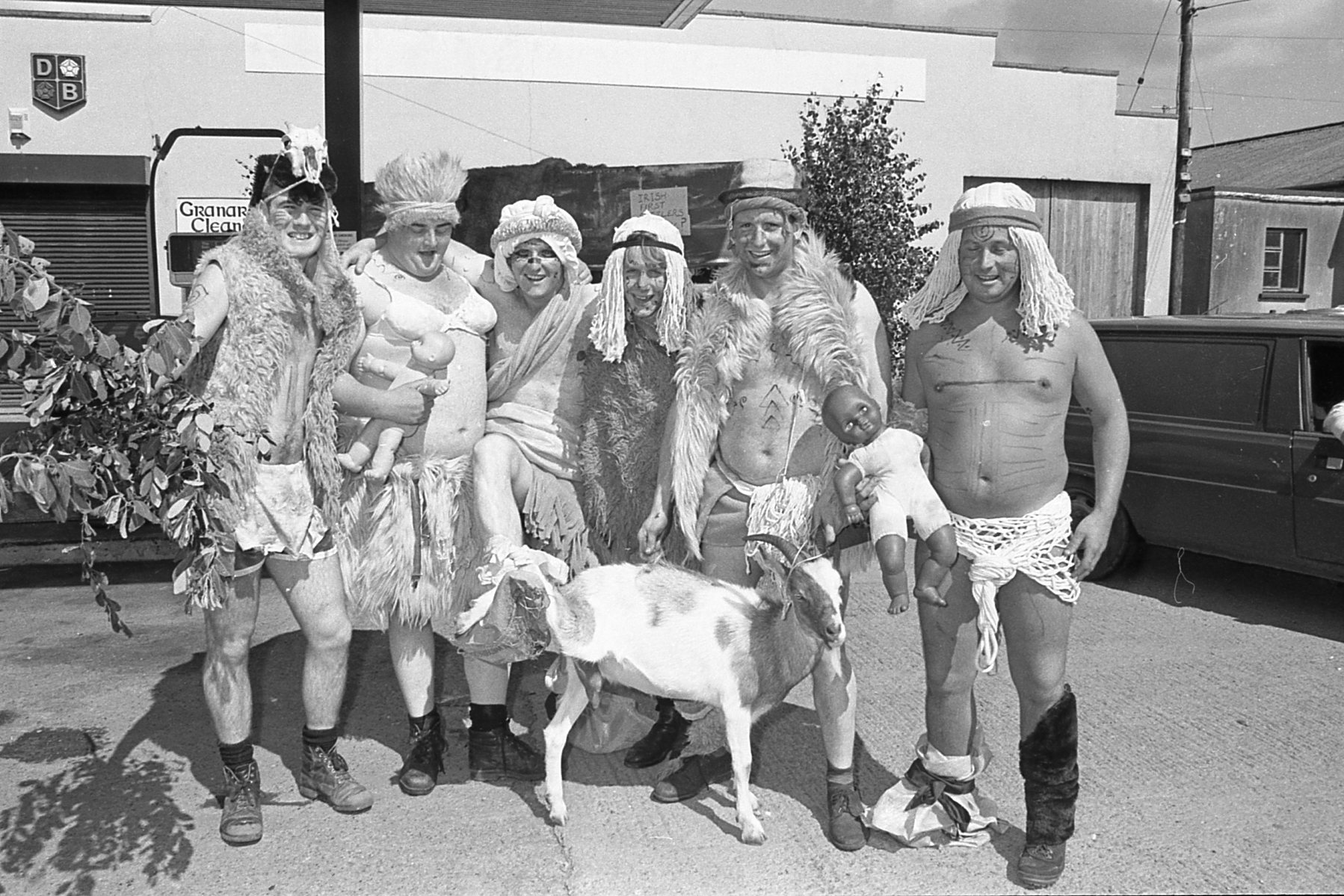CAPTION: First Irish Settlers... pictured during a parade of all things cultural, historical and commercial at Granard Harp Festival in August 1996 were (l-r) – Patrick Durkin, Tony Neary, Turlough (Pott) McGovern, Owen Martin, Shane McGovern and Pat O'Hara with goat and babies! PICTURE: JOE MCDONAGH