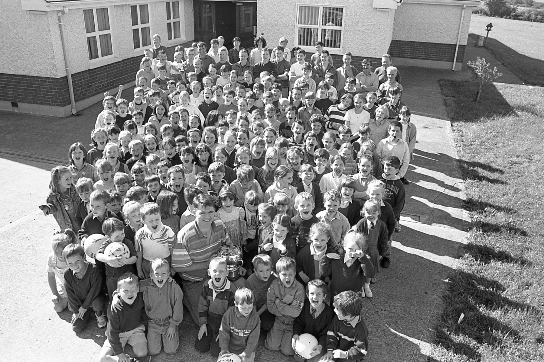 CAPTION: Sharing the glory with the younger generation... the Fr Manning Gaels Senior Football team – the 1996 County Champions – took time out in September 1996 to travel around the parish with the Sean Connolly Cup. Captain Frank McNamee and some team mates are pictured above with pupils and staff of Drumlish Primary School PICTURE JOE MCDONAGH