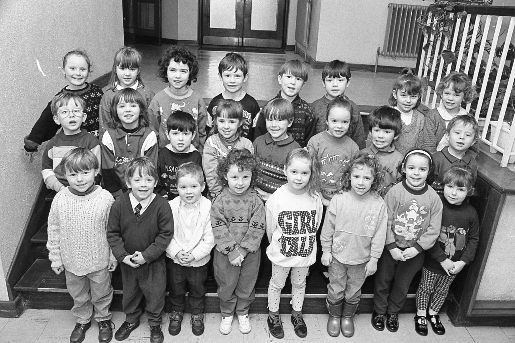 Caption: Longford Convent Class of the Week: Sr Mercy’s class of Junior Infants at Longford Convent, Class of the Week in the Longford Leader, edition, February 12, 1993. Front row l to r; Michael Munnelly, Wayne Donlon, Sean Stokes, Mary Killane, Stacey Ann Stokes, Sarah Farrell, Gillian McCormack and Amy Brennan. Middle; Steven O’Brien, Darina Dowd, Gary Devlin, Laura Devlin, Michael Madden, Cassandra Stokes, Enda Maloney and Simon Daly. Back; Julie Nevin, Catherine Lee, Maria Boardman, Patrick Hackett, Ross Brady, Cathal Lawlor, Aoife Killane and Marina Donlon. Photo by Joe McDonagh